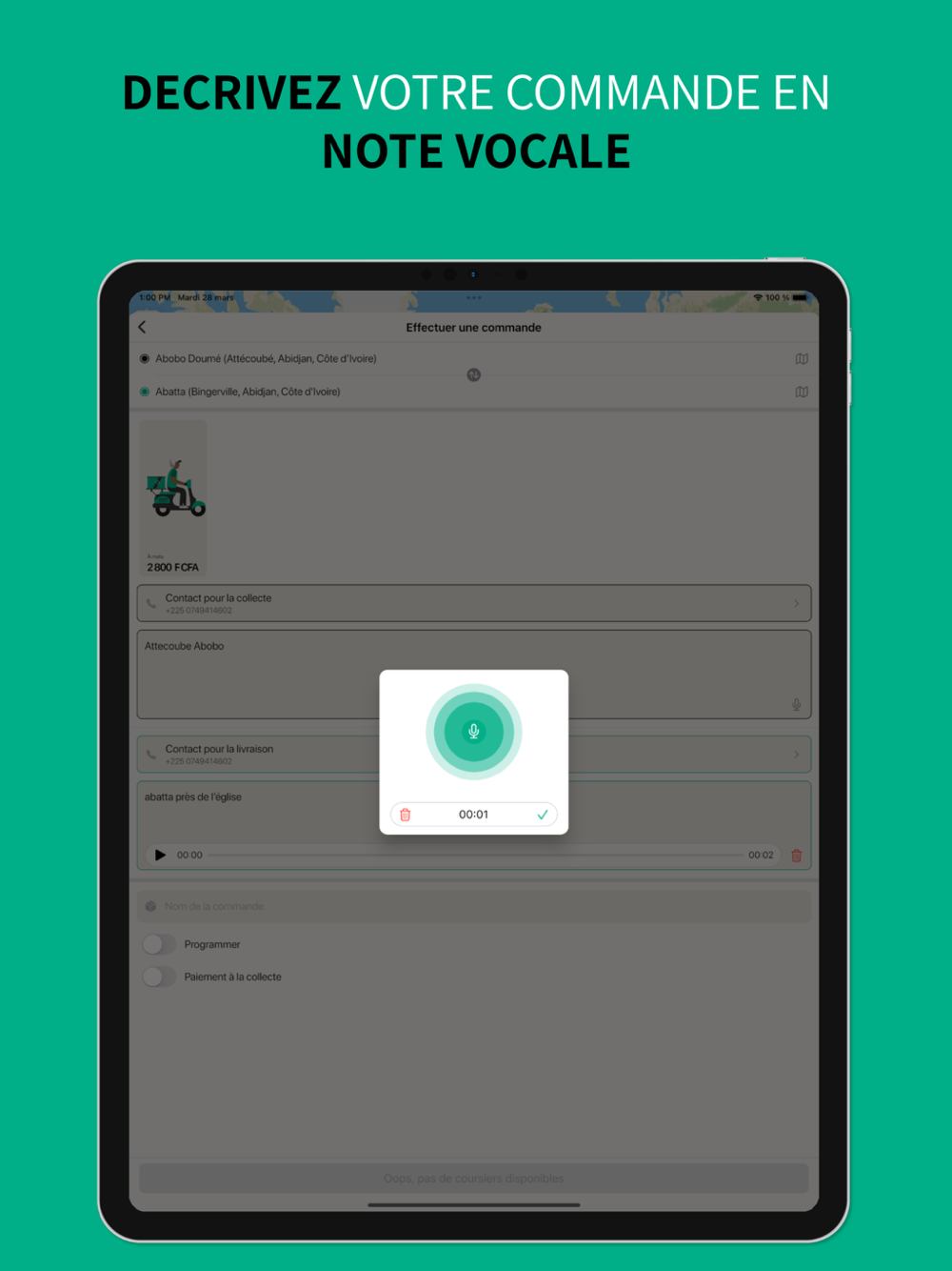 L'application de livraison de colis qui offre aux clients une expérience de commande facile et pratique. Les clients peuvent utiliser la fonction de texte ou de voix pour décrire leur commande, ce qui permet de personnaliser leur demande de livraison en fonction de leurs besoins spécifiques.