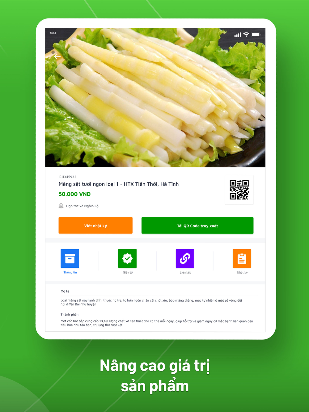 Tạo sản phẩm trên hệ thống truy xuất nguồn gốc đạt chuẩn quốc gia, cung cấp đầy đủ thông tin về nguồn gốc xuất xứ, giấy tờ liên quan, hướng dẫn sử dụng, nhật ký sản phẩm, các hệ sinh thái liên quan,... góp phần nâng cao giá trị của sản phẩm trên thị trường.