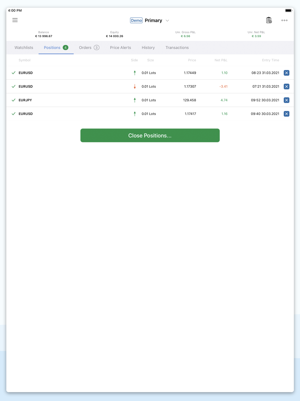 Just log in with your Apple, Facebook and Google account, or your cTrader ID and get access to a complete range of Order Types, advanced Technical Analysis tools, Price Alerts, Trade Statistics, Advanced Order Management settings, Symbol Watchlists and a variety of other settings to customize the platform to your on-the-go trading requirements.