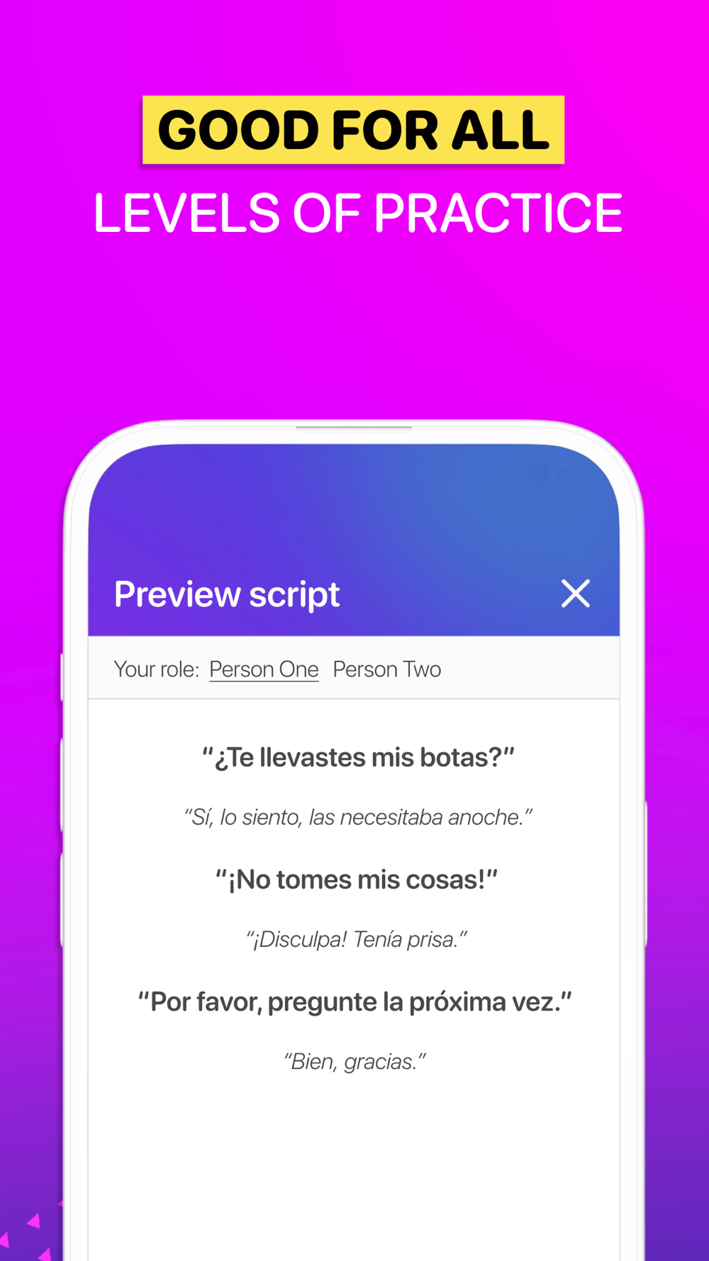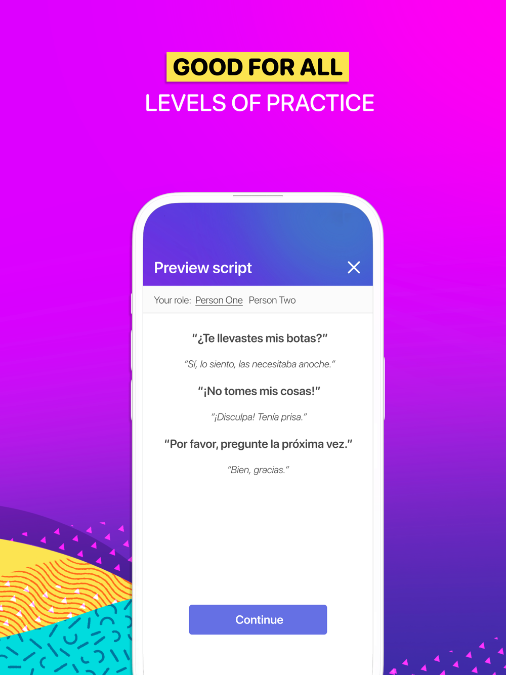 Best of all, Everyday is free to play, and you can unlock the full library of practice conversations by recording a script in your native language. This helps us to continue to grow our library of languages and practice conversations, and gives you the opportunity to contribute to the language learning community.