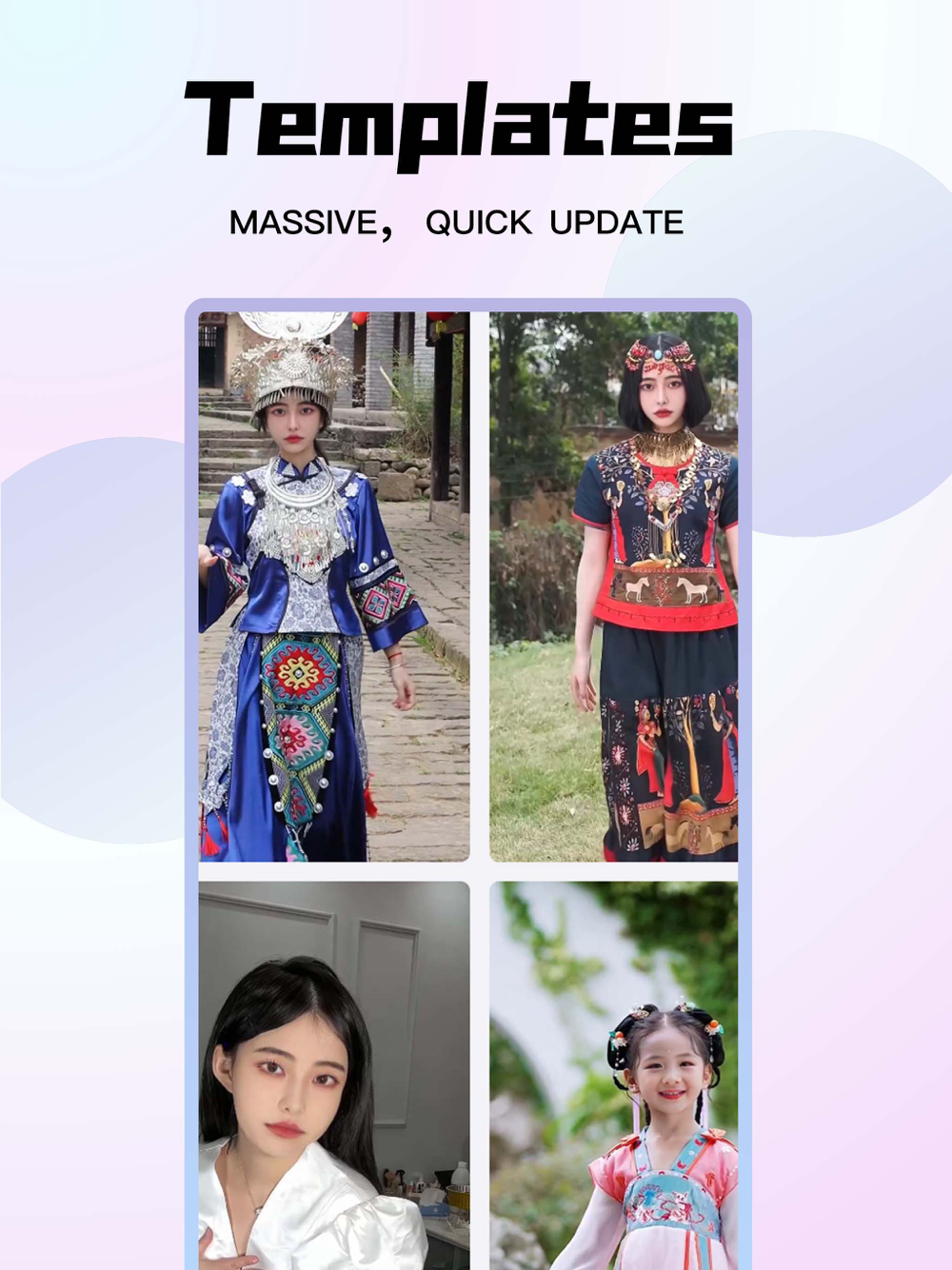 Ethnic costumes: Internet celebrity popular ethnic style change dress with special effects, feel 56 ethnic styles, and easily generate ethnic special effects videos with your own photos