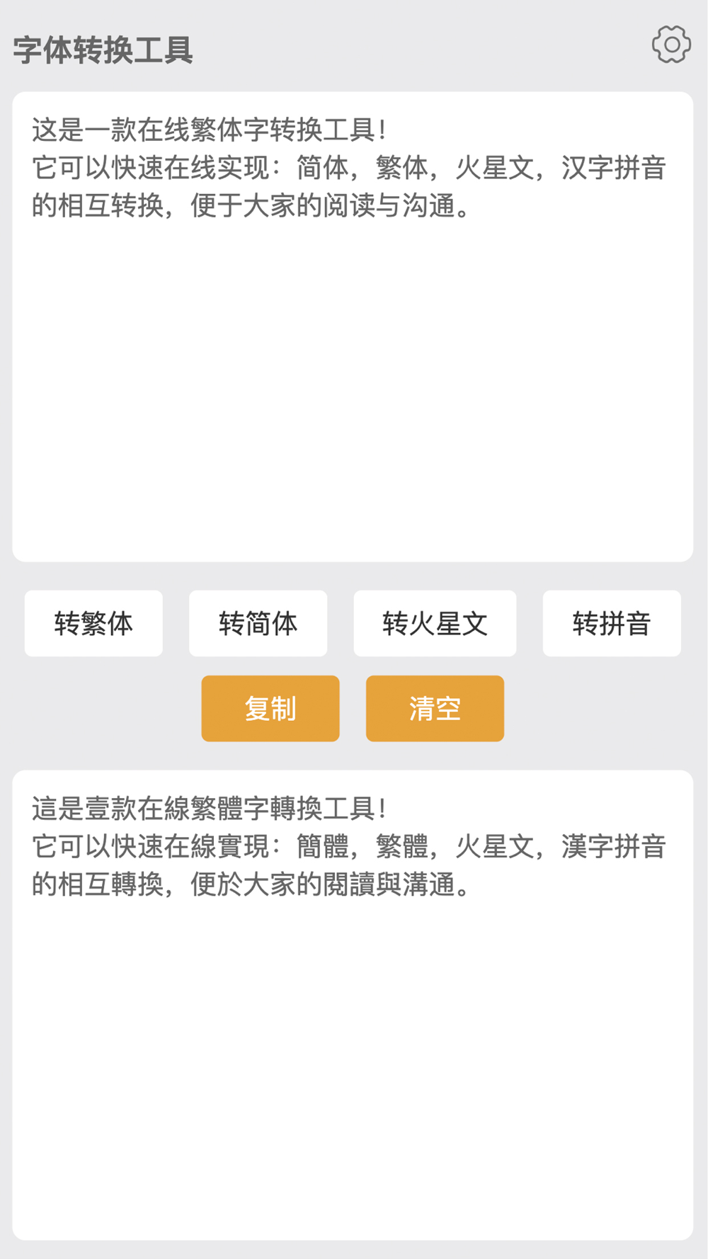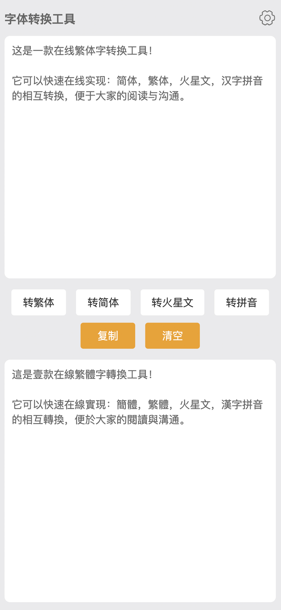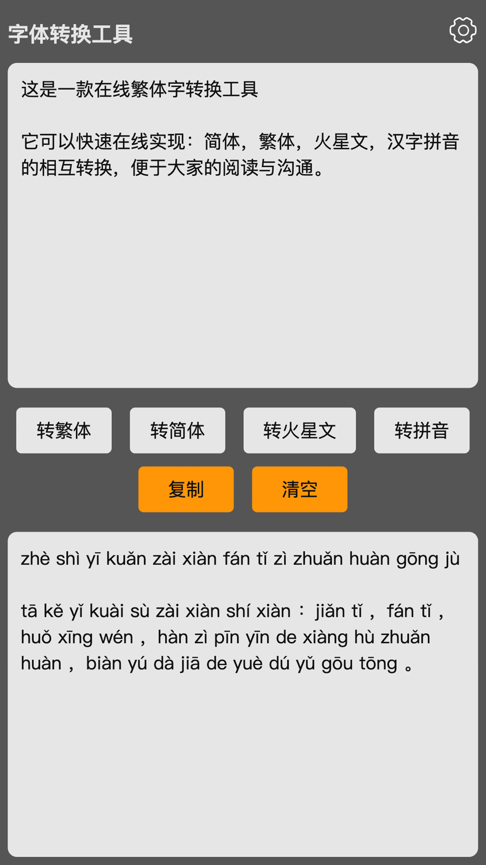 这是一款在线繁体字转换工具!它可以快速在线实现:简体,繁体,火星文,汉字拼音的相互转换,便于大家的阅读与沟通。