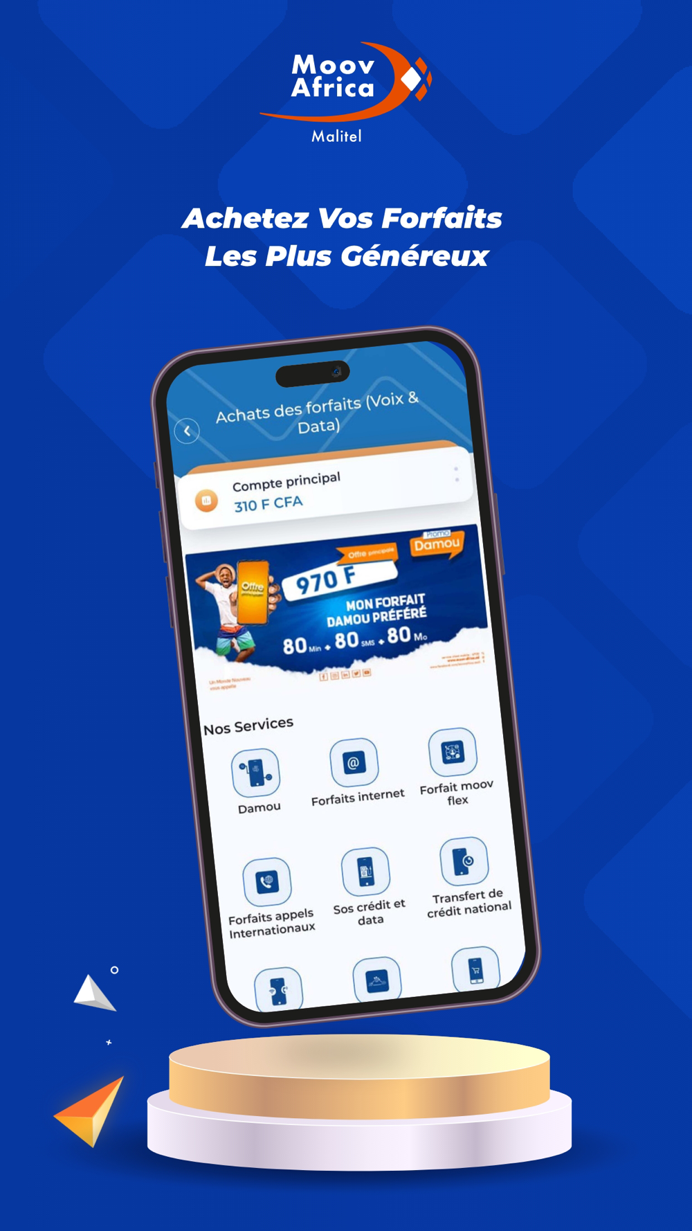 Souscrivez directement à vos forfaits préférés (forfaits internet, Moov Flex, Damou, forfaits appel international, forfaits mensuels prépayés, etc.).