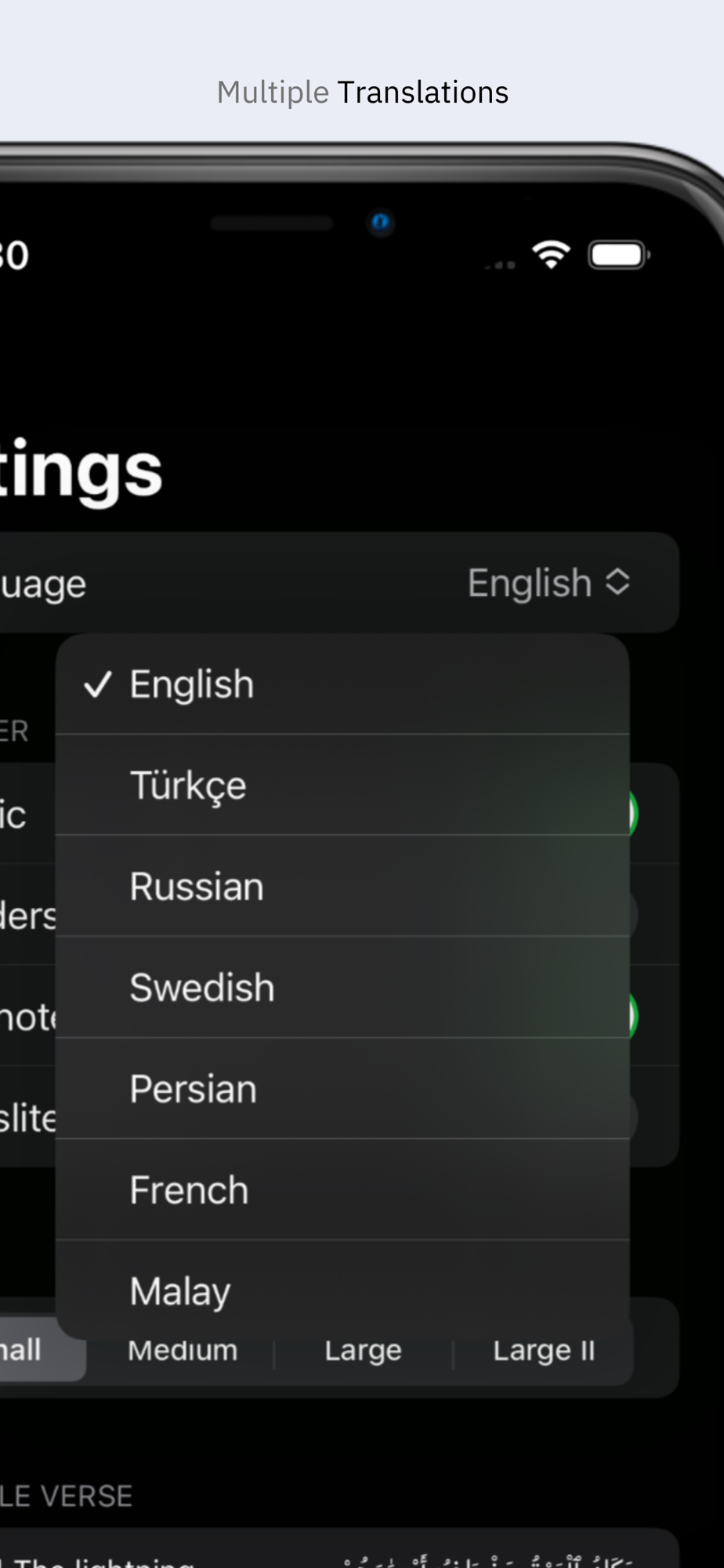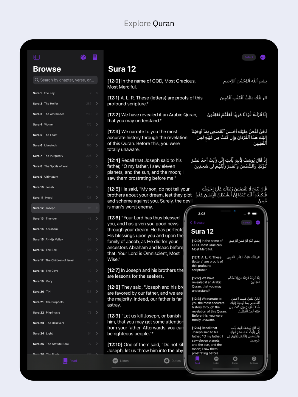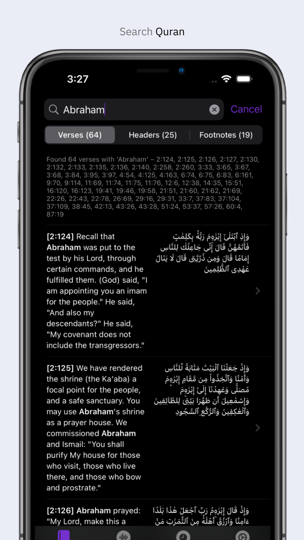 Read the way you prefer – toggle on or off verse headers, footnotes, transliteration, or the Arabic text.