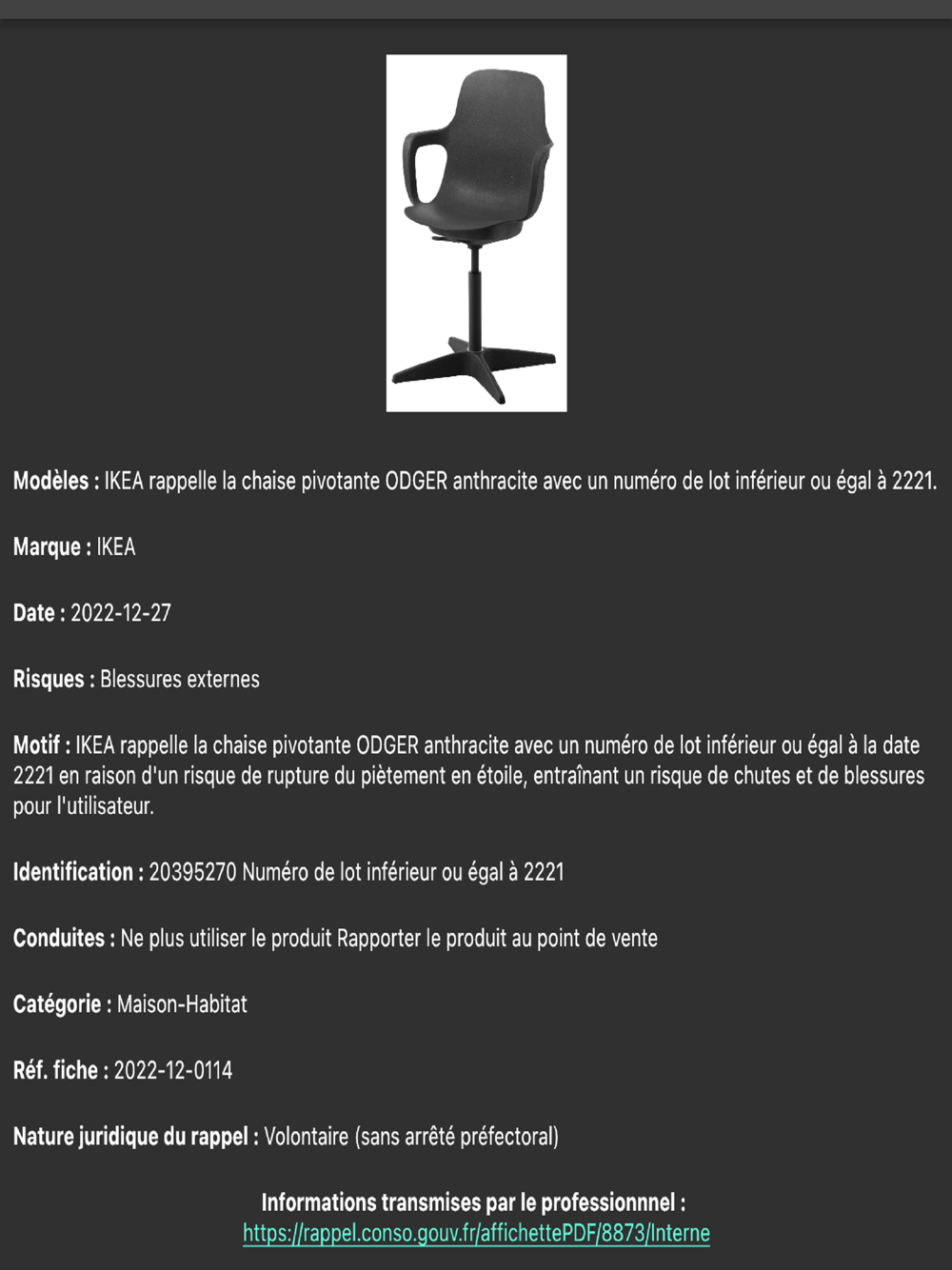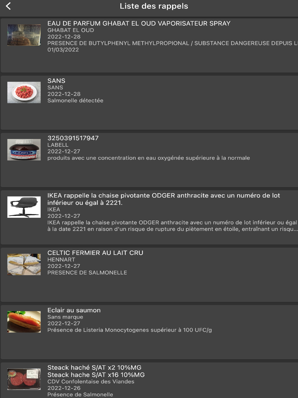 Cette application AlerteProduitApp fournie la liste de tous les produits dangereux qui font l'objet d'un rappel officiel.