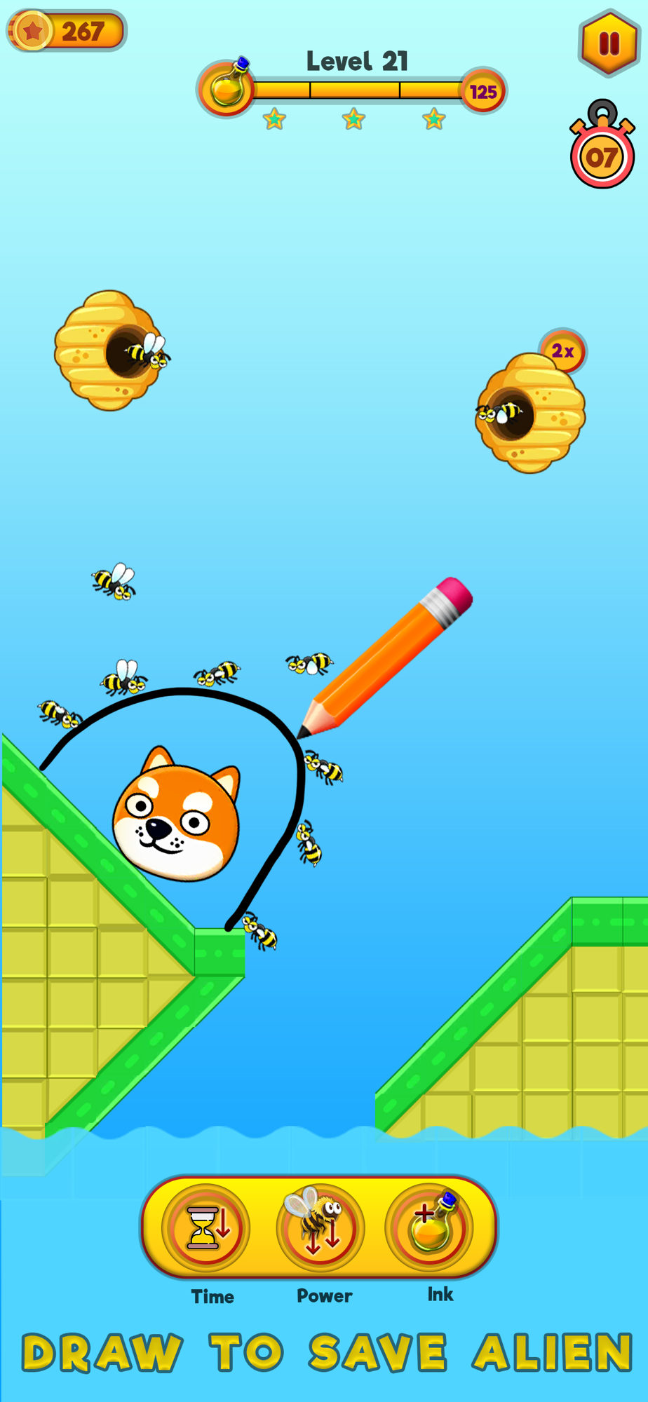 Draw the shelter around the puppy to save it from the sting of the bee. You need to save the doggy by lines for 10 sec from the sting of the bee to clear the stage. Every stage has many ways to clear it.