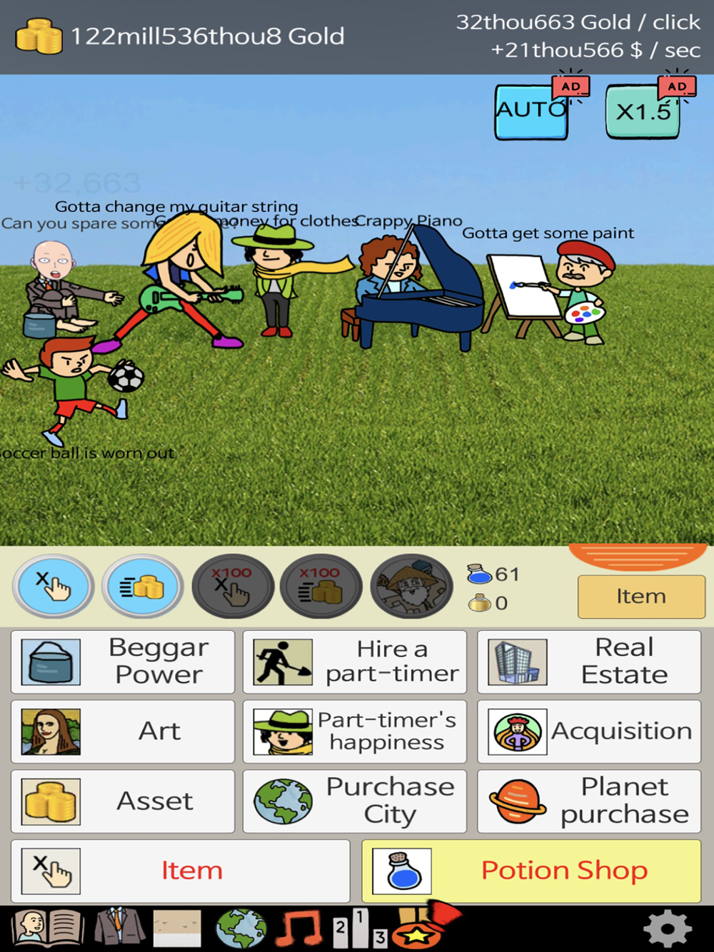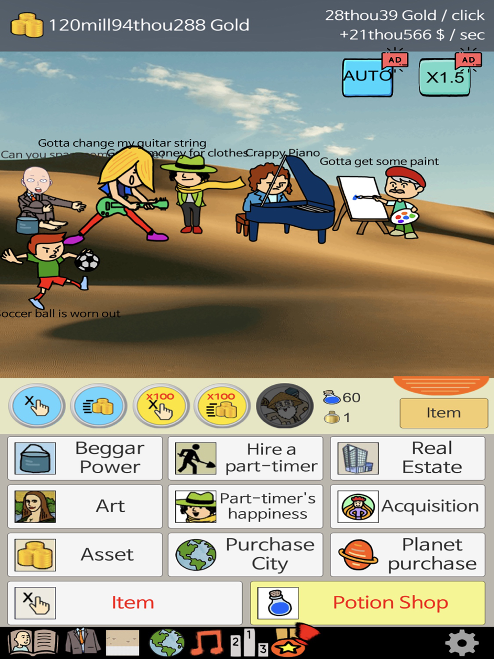 Imagine that you are the CEO who is handling the Beggar Company, your job is to increase your management skill for taking more money and gold per click!