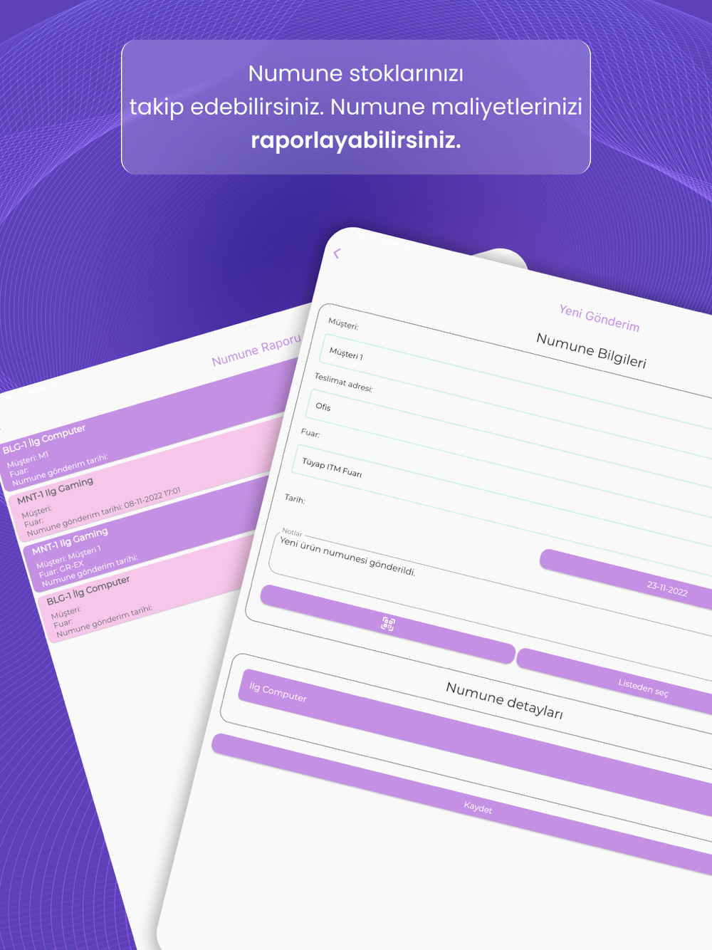 Numune stoklarınızı ve numune gönderdiğiniz müşterileri takip edebileceğiniz, numune maliyetlerinizi raporlayabileceğiniz,
