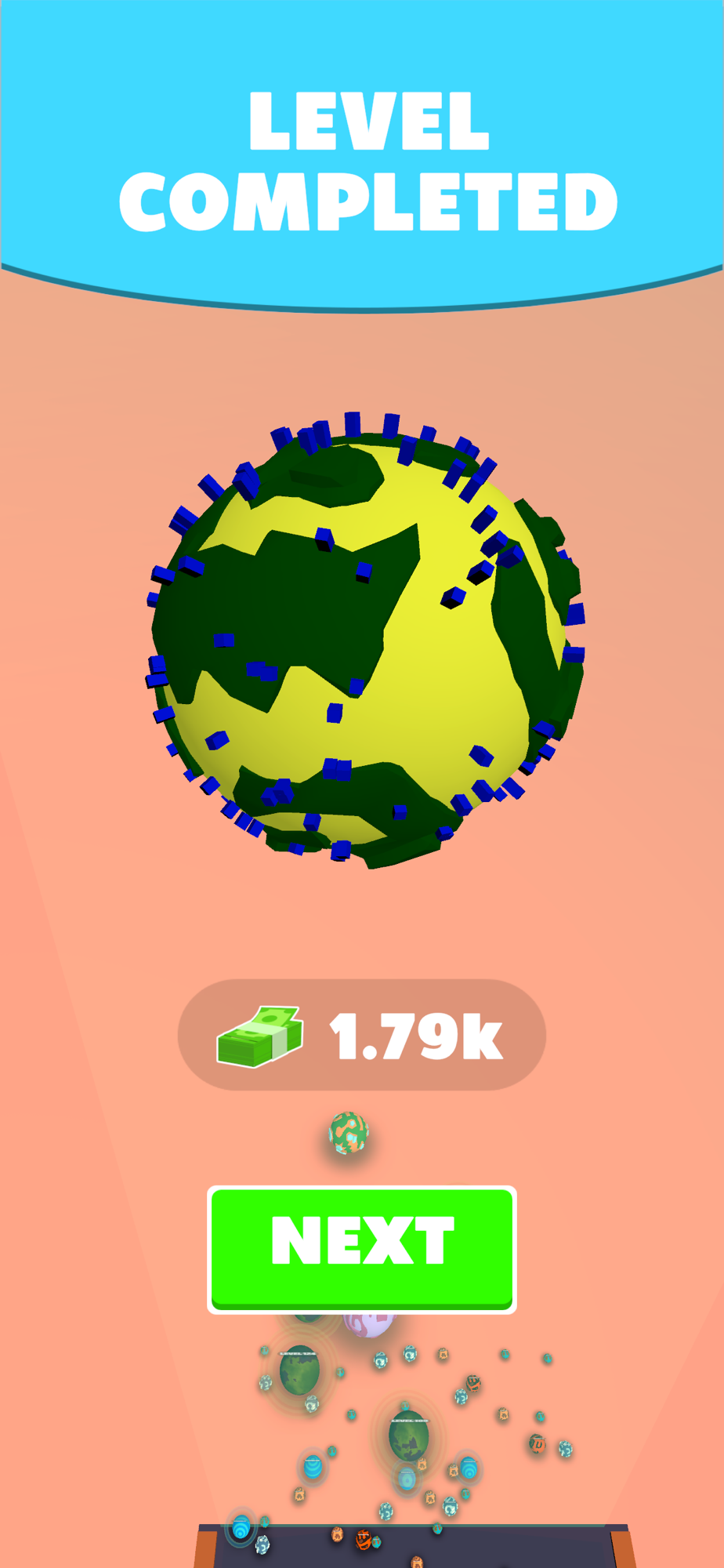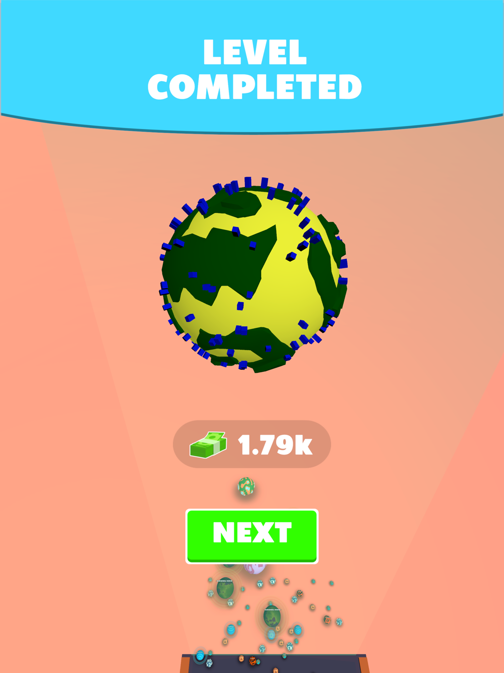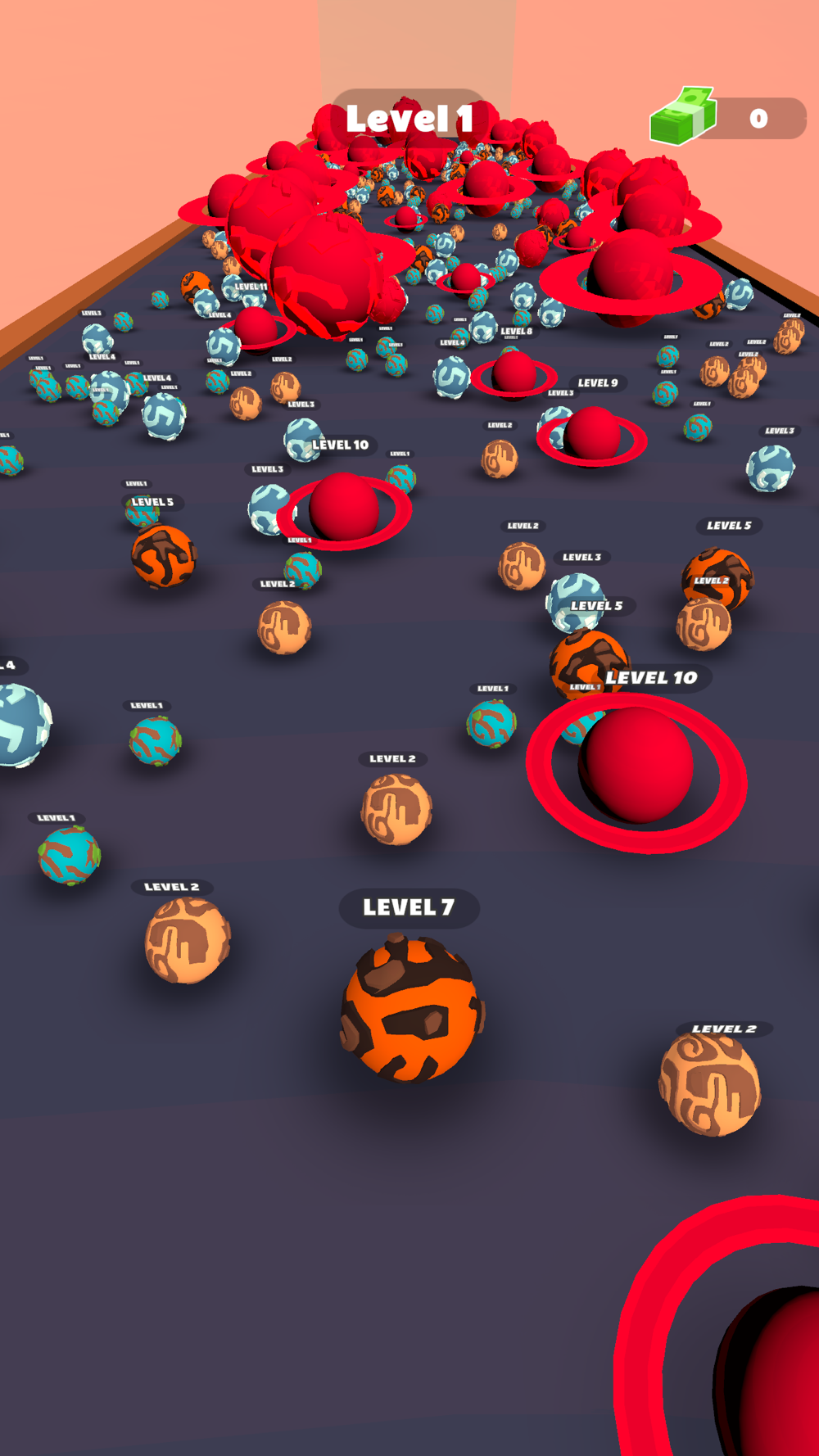 Start with a small planet and upgrade it by merging with others.