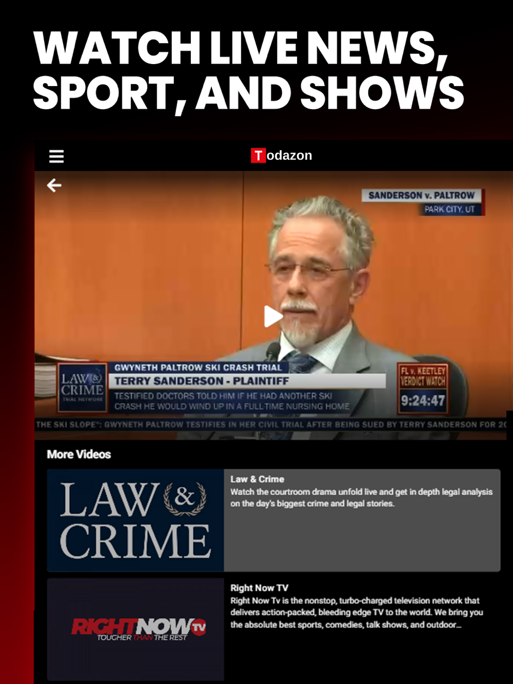 Todazon is a streaming service that allows our subscribers to watch Live News, TV shows, documentaries, and more on internet-connected devices.