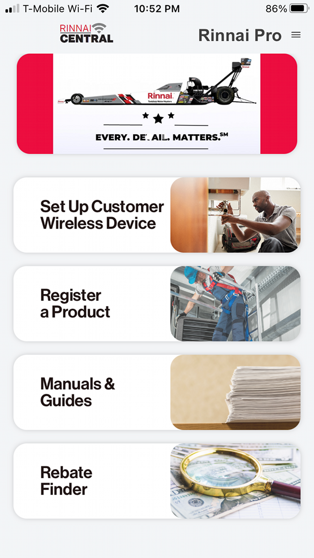 PROs / Installers: Stay connected to Rinnai and your customers from anywhere.