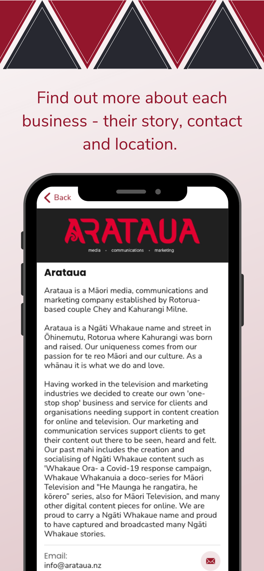 ‘Whakaue Pakihi is a listing app where you can easily find key details for each Pakihi (business) and scroll through their amazing products and services.