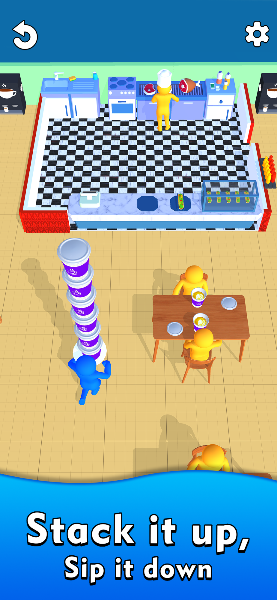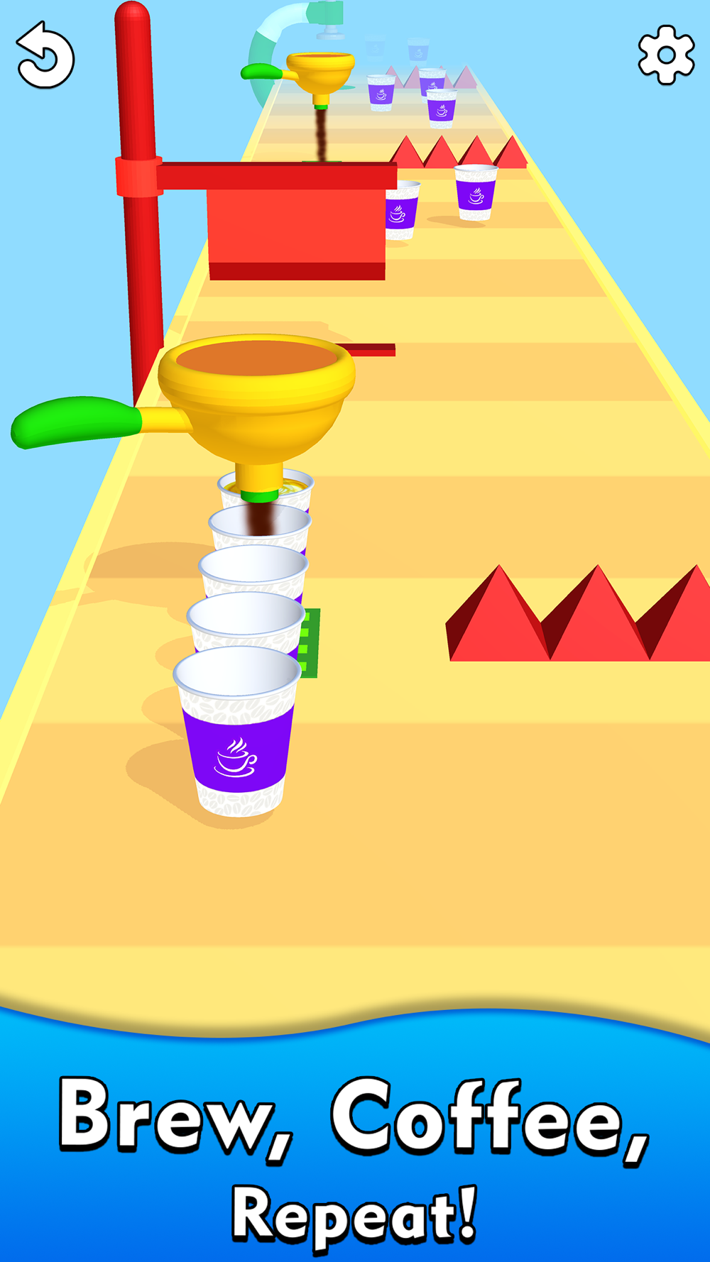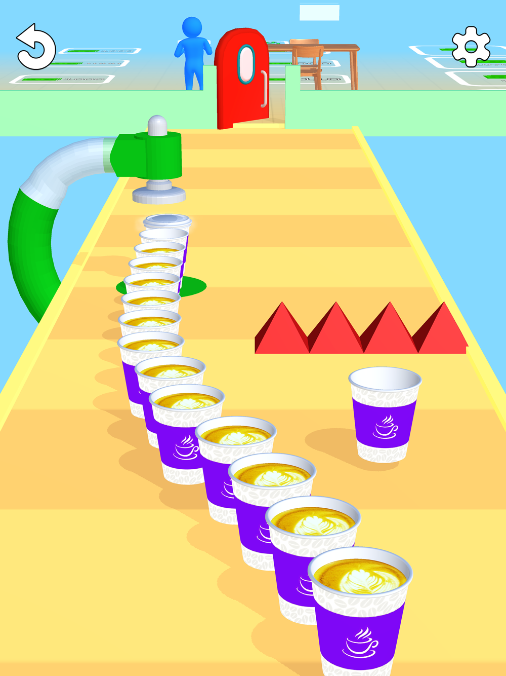 In the coffee stacking game, players are challenged to stack coffee cups in a long queue, filling them up with their favorite coffee flavors.