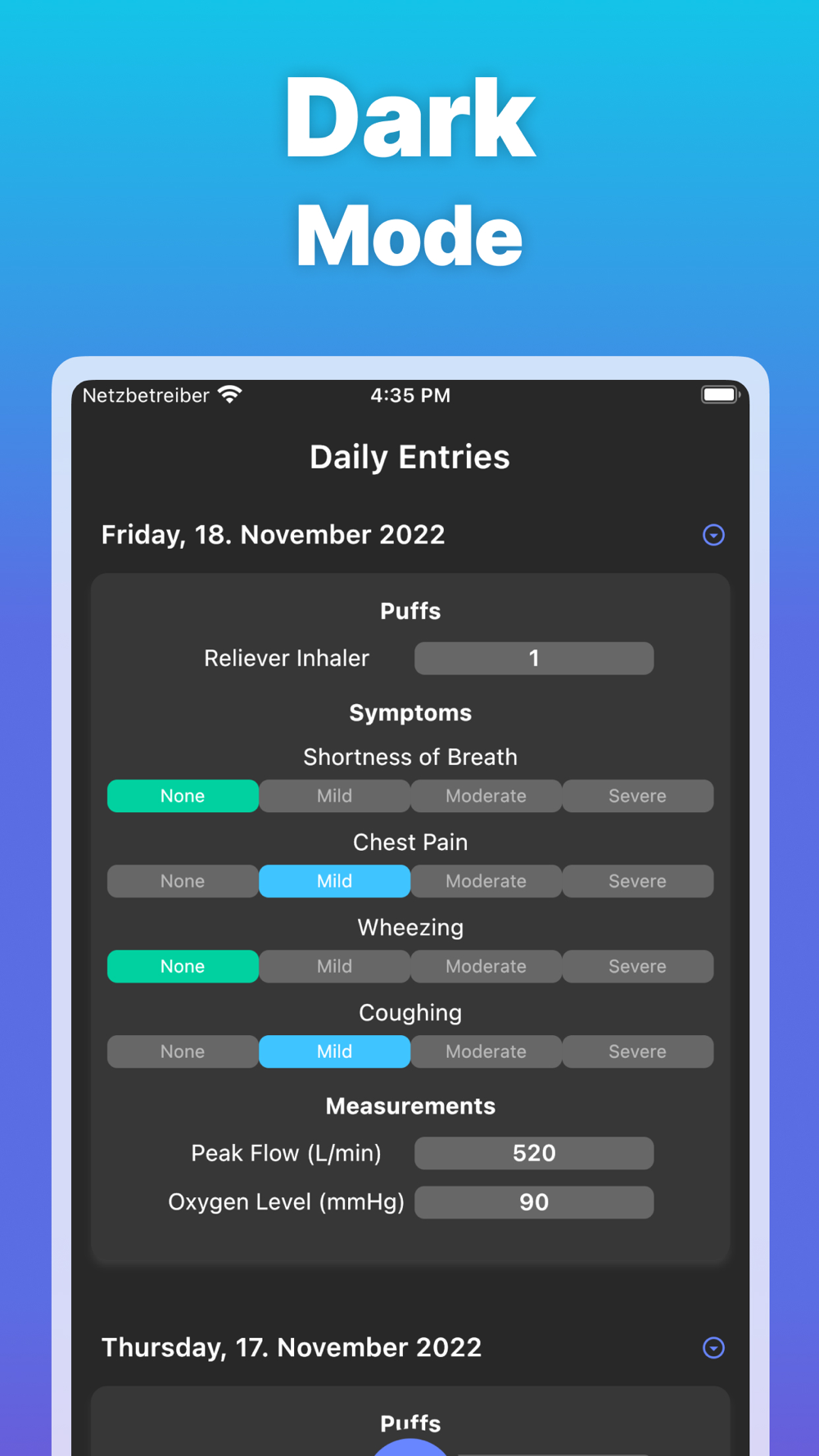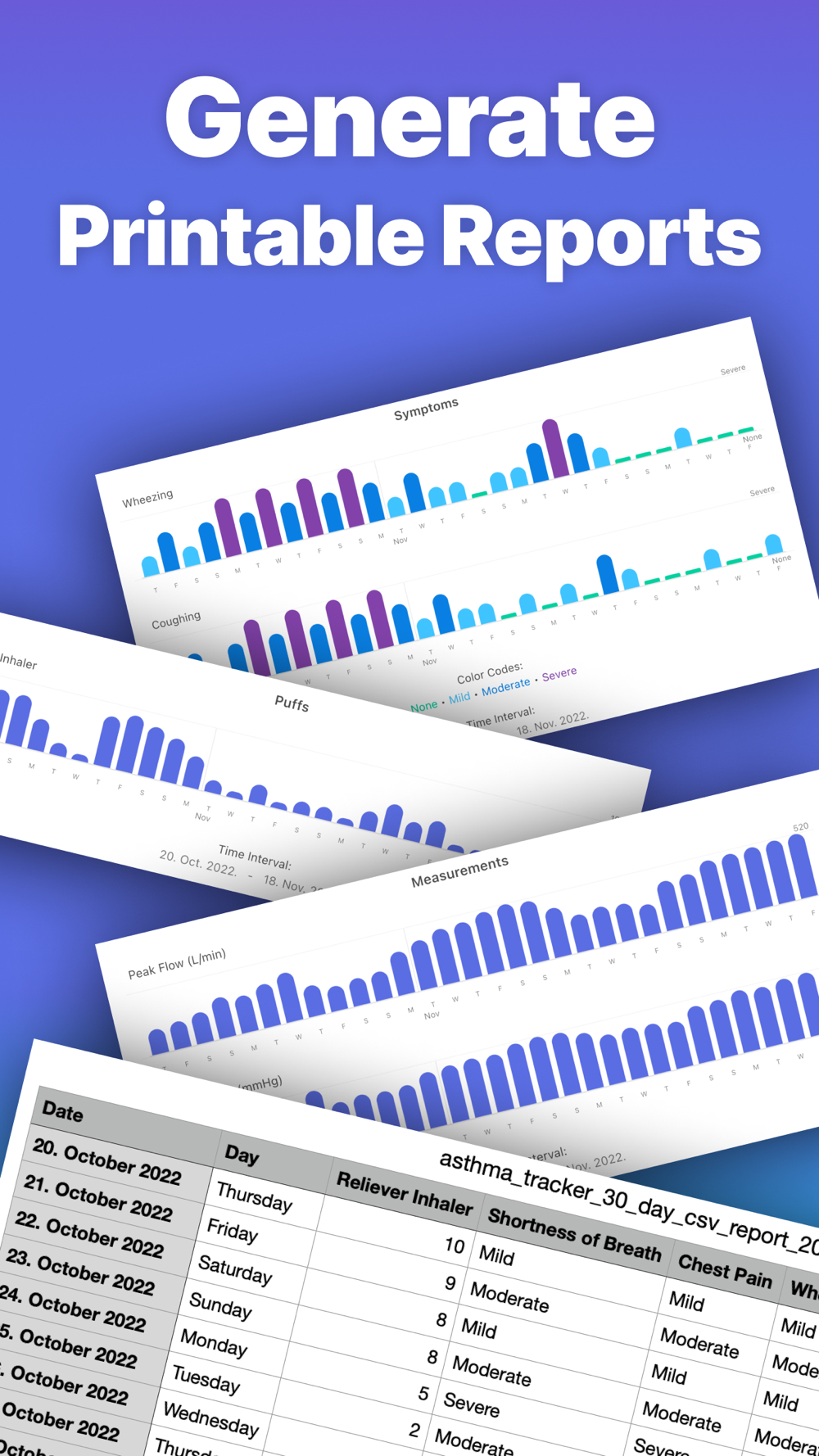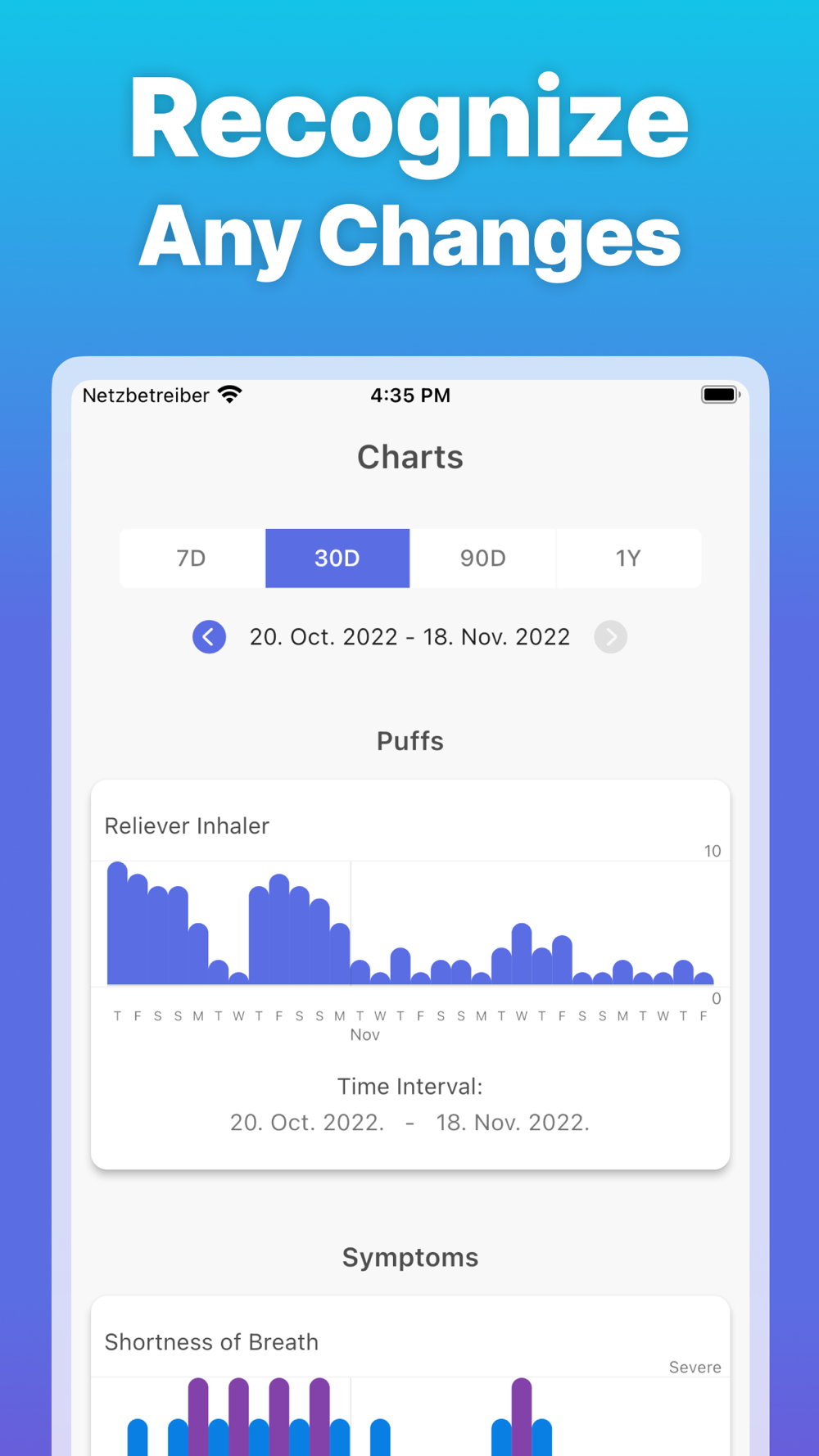 Track your inhaler usage, follow symptoms, take measurements, write notes and visualize it all by a single tap!