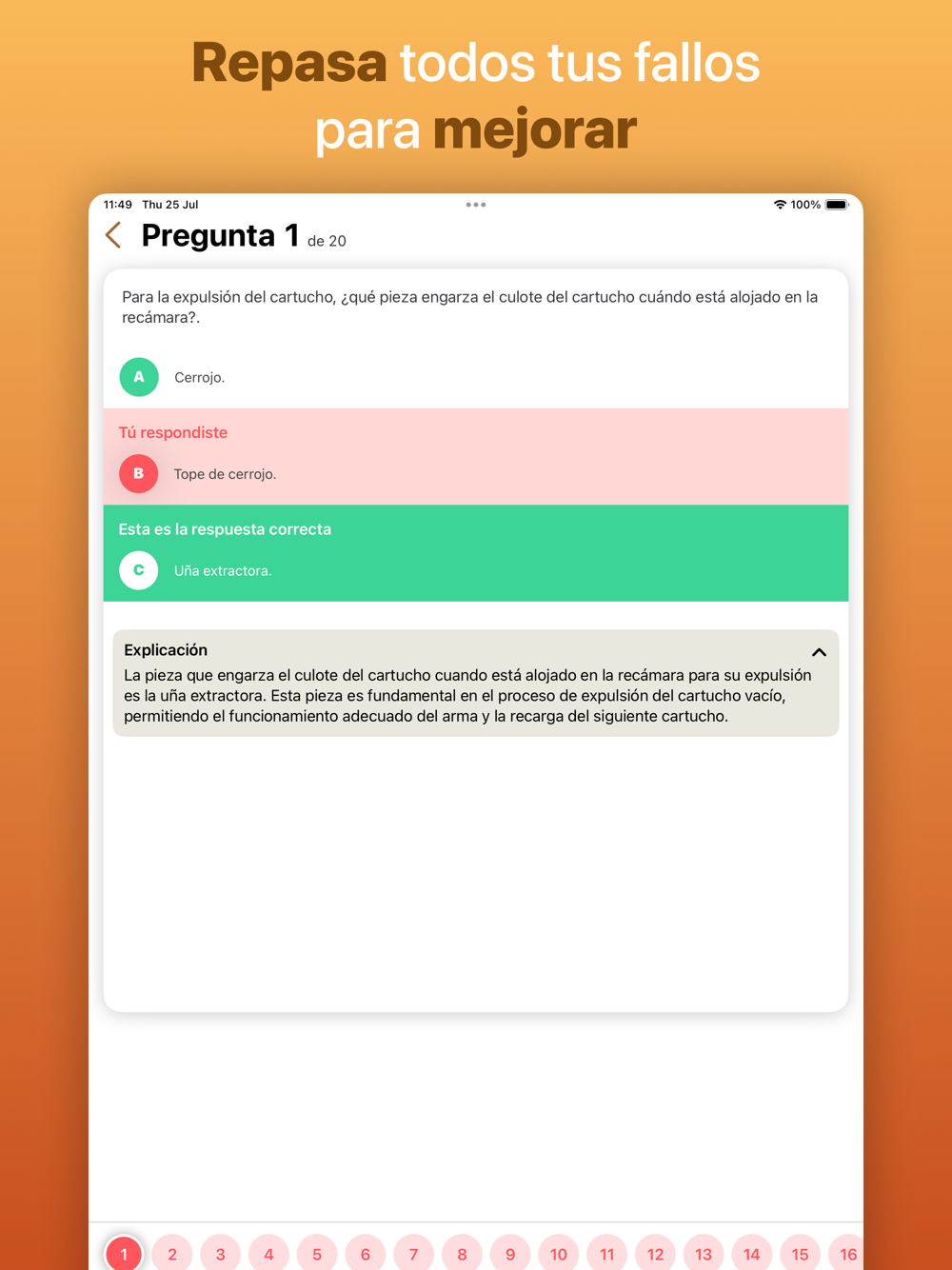 Entendemos que lo más importante es el contenido, por eso hemos diseñado una interfaz sencilla, clara y limpia que te permite concentrarte en lo realmente importante: aprobar tu examen de licencia de armas.