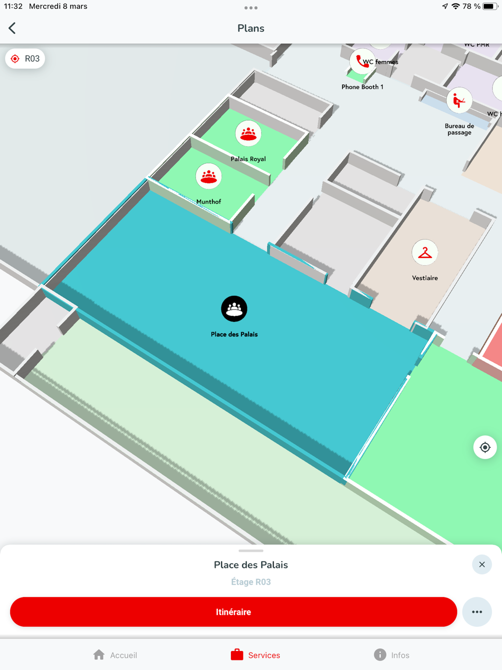 - Building plans, indoor geolocation (guide me) and meet me