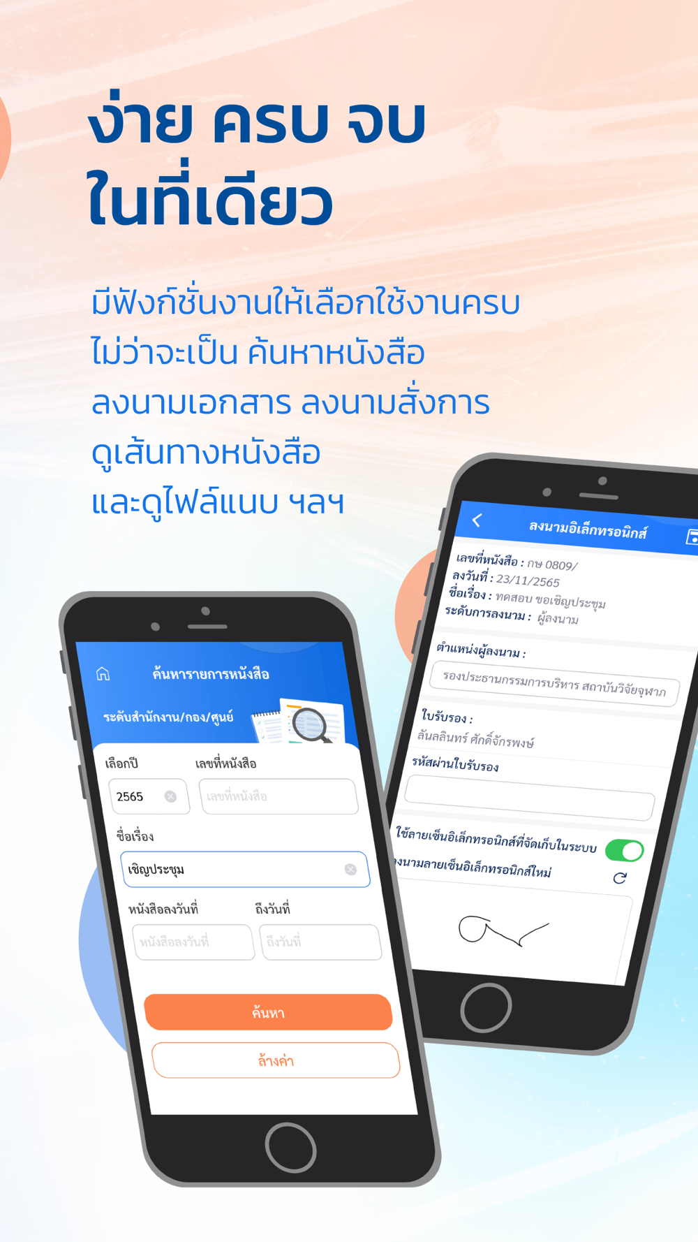 - ค้นหา หรือติดตามสถานะหนังสือของระบบงานสารบรรณอิเล็กทรอนิกส์ สามารถ ติดตามและสืบค้นหนังสือได้อย่างง่ายดาย จากทุกที่ สะดวกรวดเร็ว พร้อมคุณลักษณะเด่นๆ อื่นอีกมากมาย อาทิเช่น -สิทธิ์การค้นหาหนังสือตามบทบาทที่เลือก -การค้นหาหนังสือตามเลขที่หนังสือ ชื่อเรื่องและตามวันที่ หนังสือรอสั่งการ หนังสือรอลงนาม หนังสือเวียน