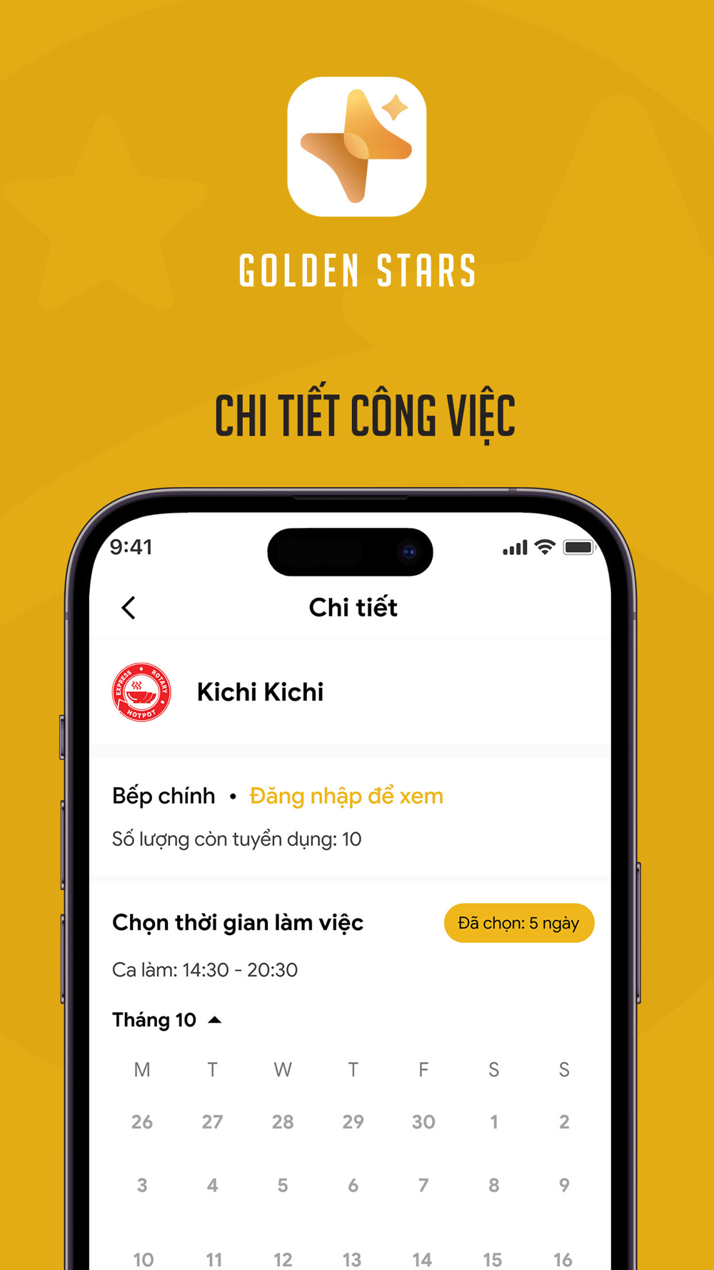 Golden Stars là một trong số các sản phẩm ứng dụng được phát triển bởi GOLDEN STARS HUMAN RESOURCE SOLUTIONS, là một Chợ việc làm, để tạo ra cơ hội kết nối việc làm cho người lao động tự do và việc làm thêm ngoài giờ cho người lao động trong ngành F&B.