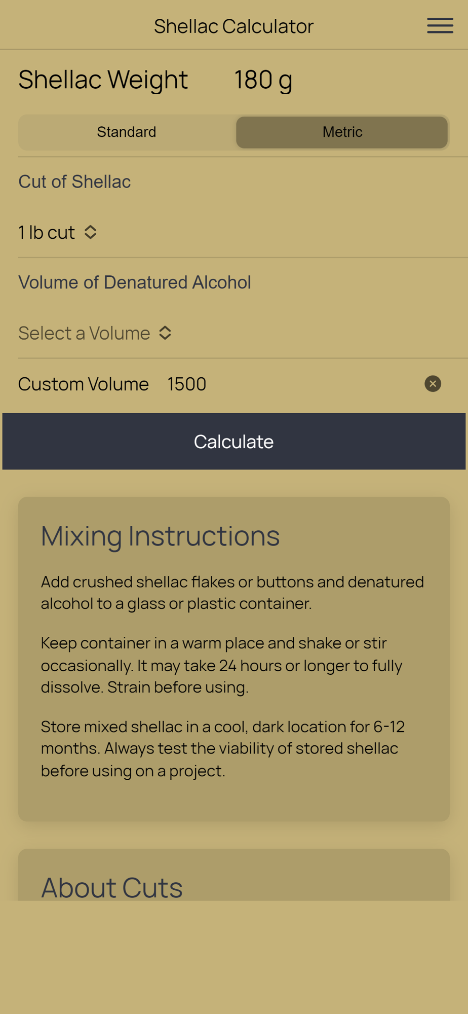 Just choose the proper pound cut of shellac and volume of denatured alcohol (oz or mL) needed for the project to calculate the amount of shellac flakes or buttons to mix.