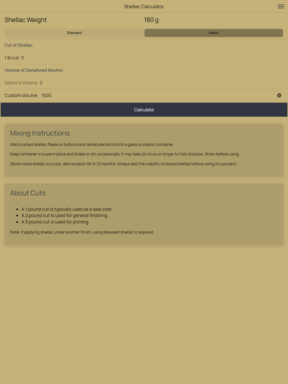 Easily calculate the weight of shellac flakes to be mixed with denatured alcohol for finishing.