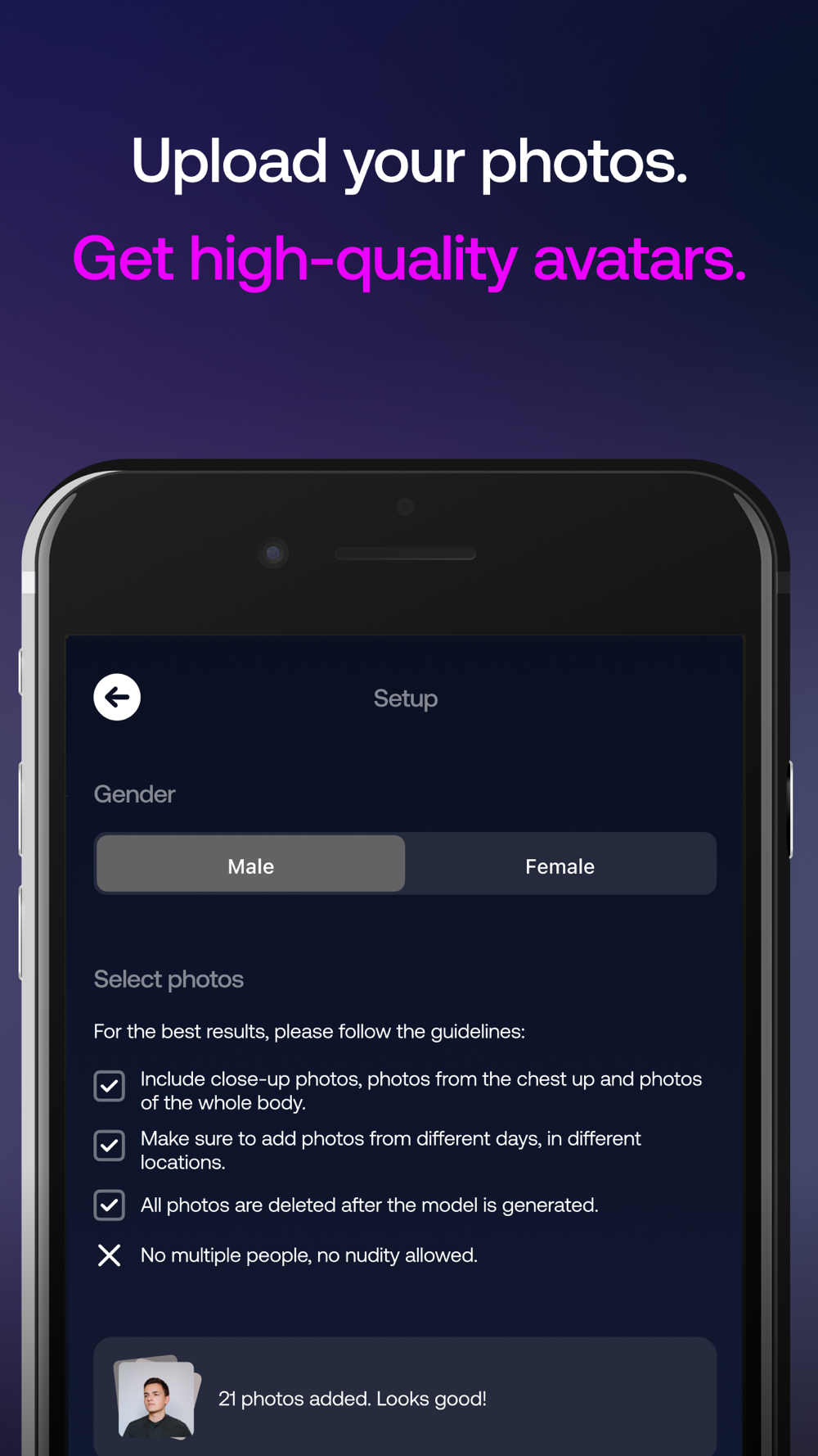 Avataria is one of the first apps to offer a personal avatar generated by AI. Simply upload 10-25 photos of you and enjoy mind-blowing dozens and hundreds of avatars for a truly one-of-a-kind look. The cutting-edge technology behind our app is based on deep learning and generative adversarial networks (GANs), which are responsible for creating the world's most realistic avatars and profile pictures.