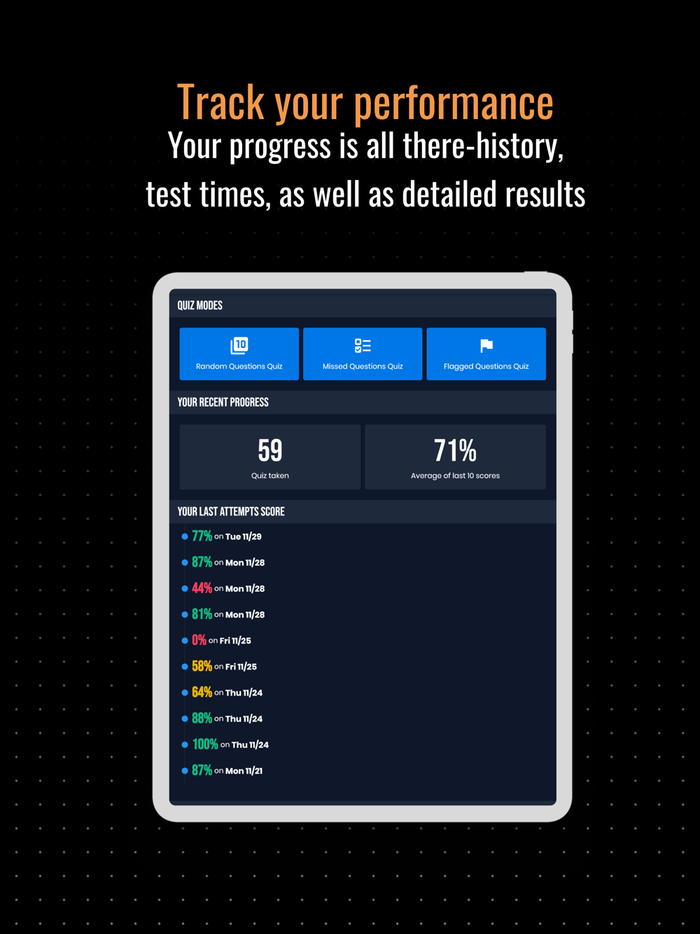 The app utilizes the “spacing effect” to enhance your learning capability. You’ll space out your studying into shorter, more productive study sessions which allow your brain to retain more information. Simply tell the app how many questions you want to take, enable the timer, and filter exam content to create the perfect study experience.