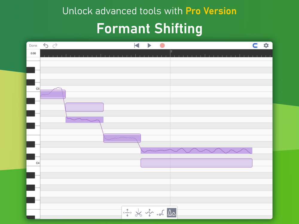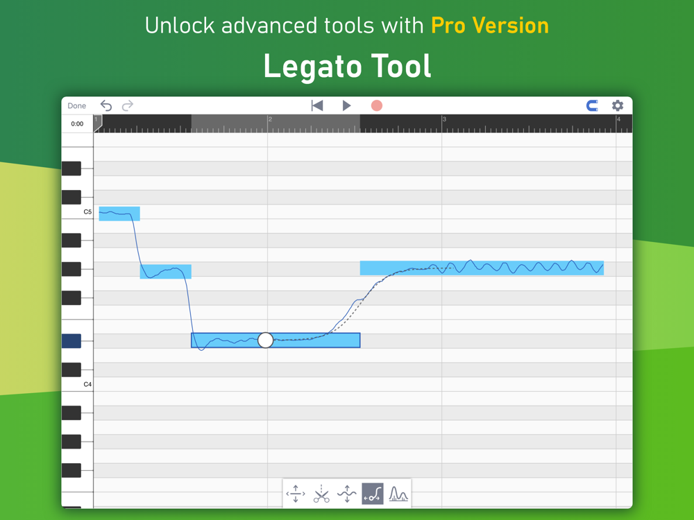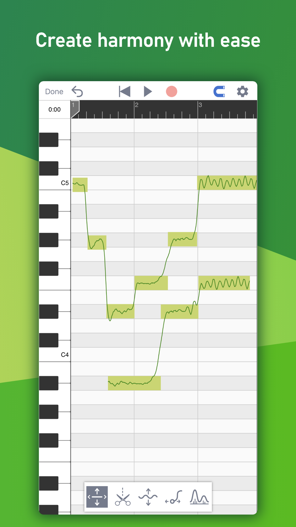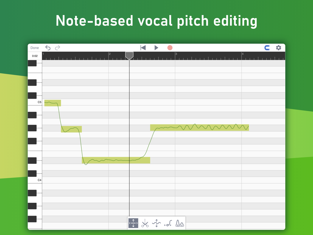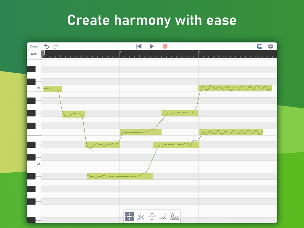 When recording vocals with MusicPutty, the app's algorithm analyzes the pitch information of your vocal takes and gives you the ability to edit them note by note. You can use it to correct pitch and timing issues or even change the original melody completely! You can also use the app's copy/paste feature to create complex harmonies with ease.