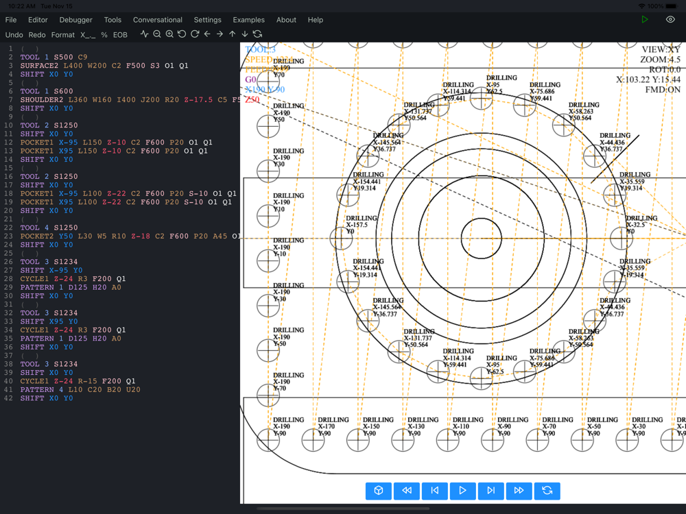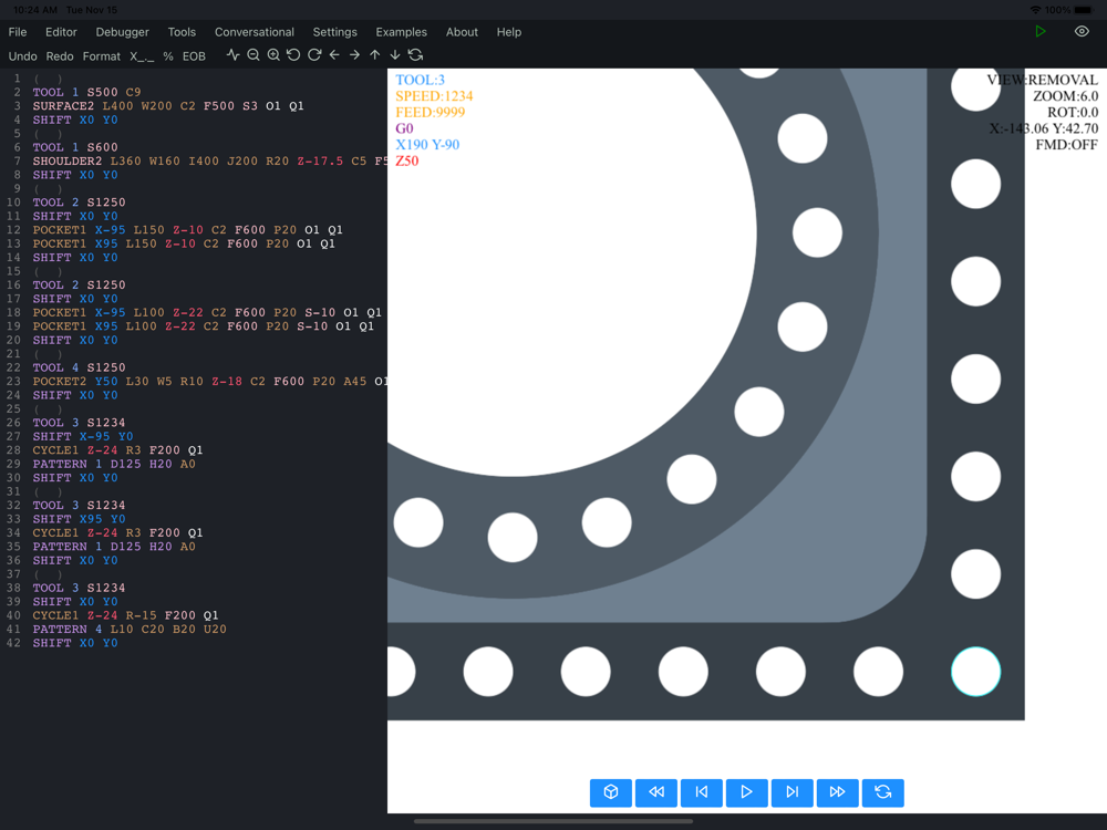 Macro Simulator CNC Conv is a powerful, modern, multi-platform CNC code editor, backplotter and simulator extended with conversational functionality. It allows you to quickly and easily take advantage of many extremely useful cycles such as helical boring, thread milling, pocket and shoulder milling, face milling and others (more in the description below), combined with the possibility of generating them as patterns (circular, angular, grid or rectangular).