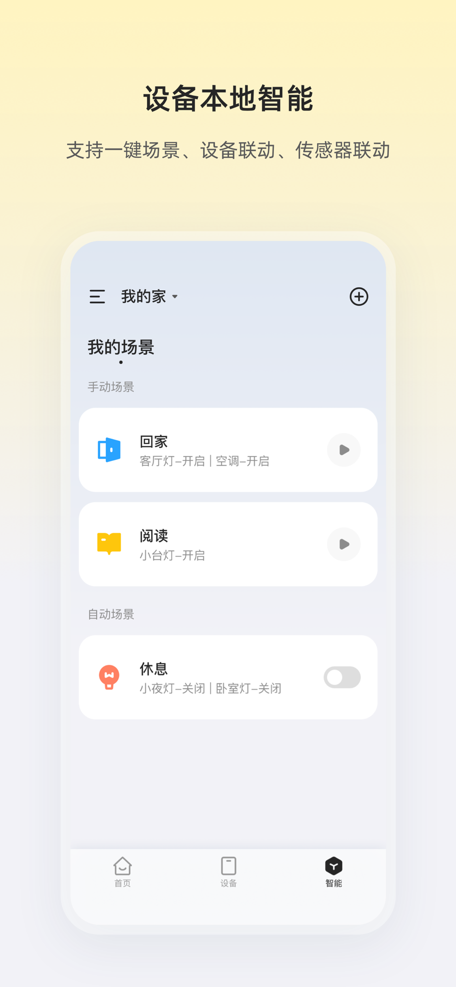 设备本地智能:无外部网络也能享受智能场景、支持一键场景、设备联动、传感器联动等丰富