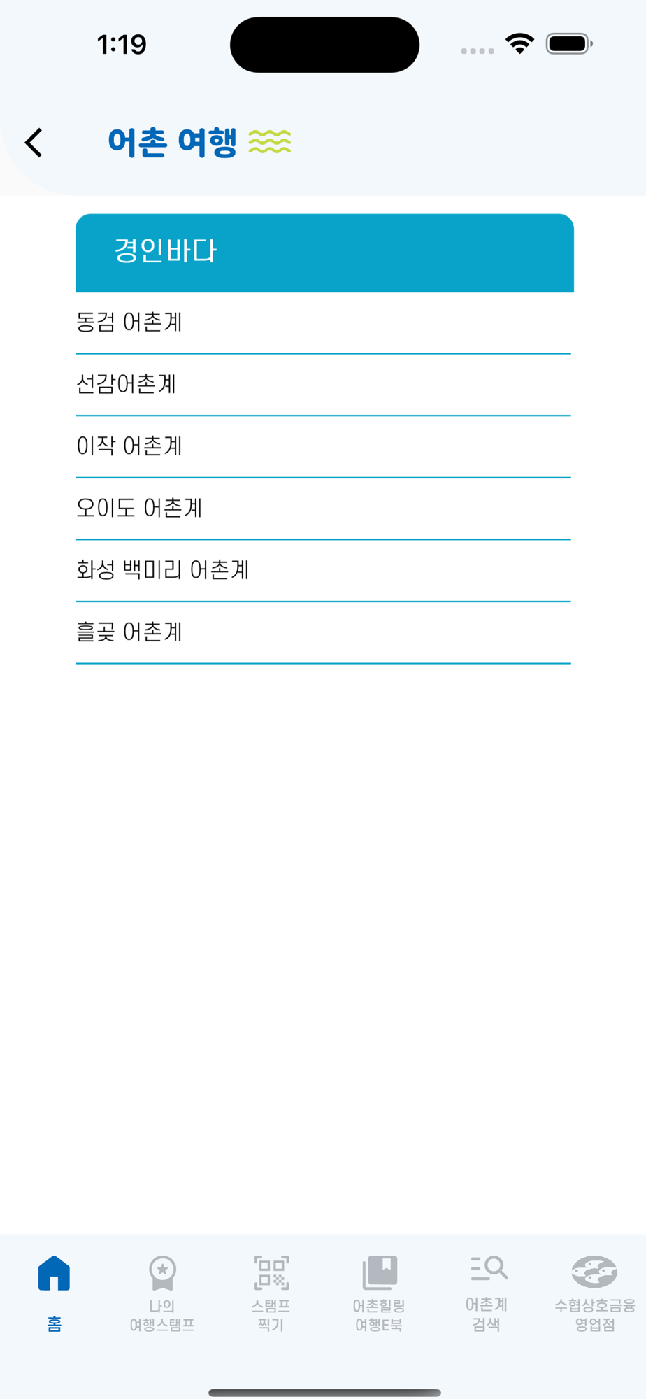 국내 어촌 곳곳의 맛집, 관광지 검색, 수협 중앙회 검색 등을 할 수 있습니다. 어촌계 방문 후 스탬프를 모아서 여행을 기록해보세요. 지역별 어촌 체험마을과 체험마을 정보를 확인할 수 있습니다.