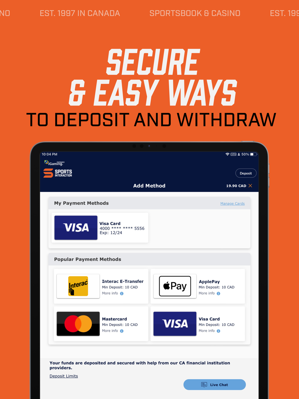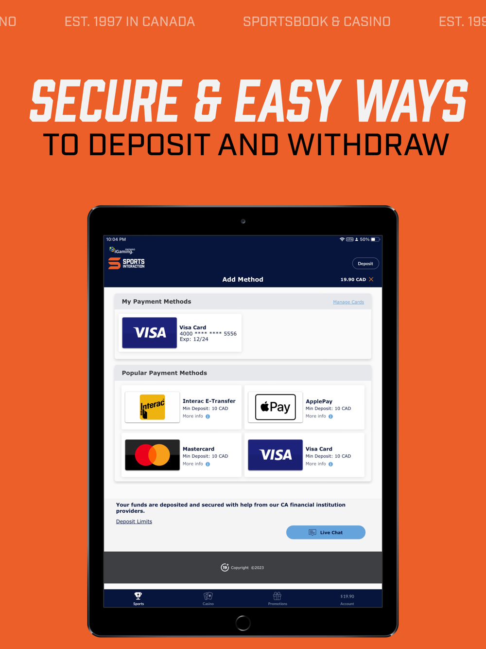- Easy and secure deposit methods, including Interac and Visa and fast cash-outs on your winnings.