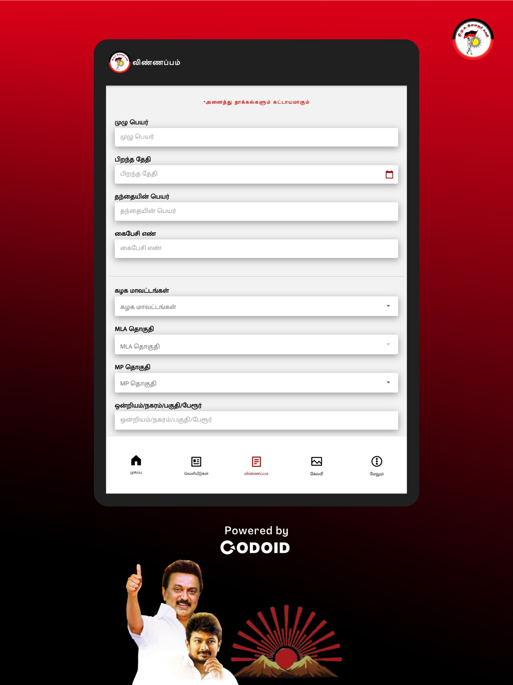 DMK Youth Wing App is a first of its kind digital application designed to facilitate two-way communication between the Youth Wing and its members.
