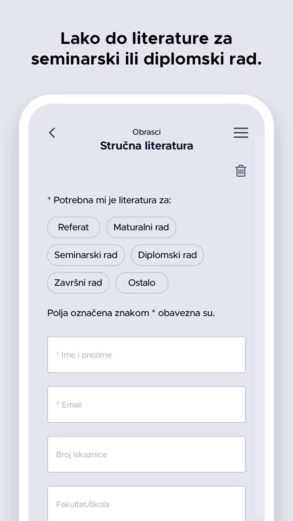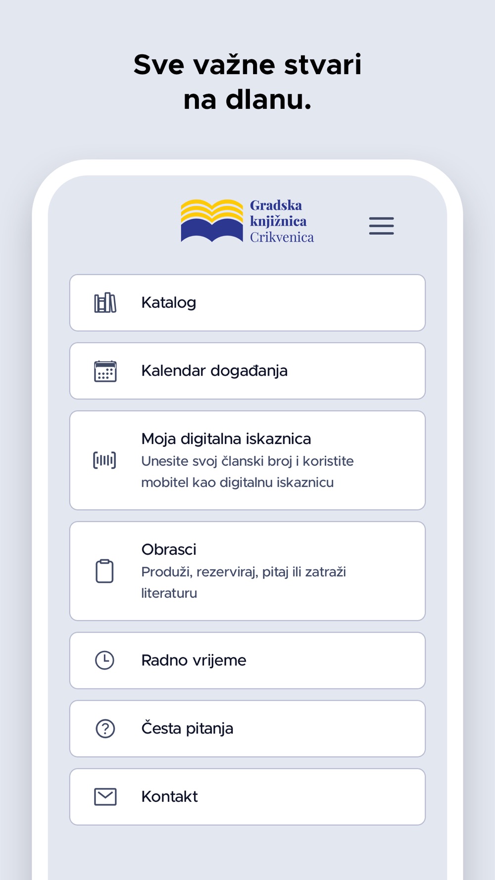 Aplikacija je namijenjena korisnicima Gradske knjižnice Crikvenica uz pomoć koje korisnici mogu pretražiti e-katalog knjižnice, pregledati kalendar događanja u knjižnici, generirati svoj korisnički broj u barkod, produžiti posudbu građe, rezervirati građu, provjeriti posjeduje li knjižnica primjerak neke građe ili zatražiti literaturu za seminarski rad. Unutar aplikacije nalaze se i Radno vrijeme knjižnice, odgovori na Česta pitanja, kontakt podaci svih odjela knjižnice te poveznice na društvene mreže.