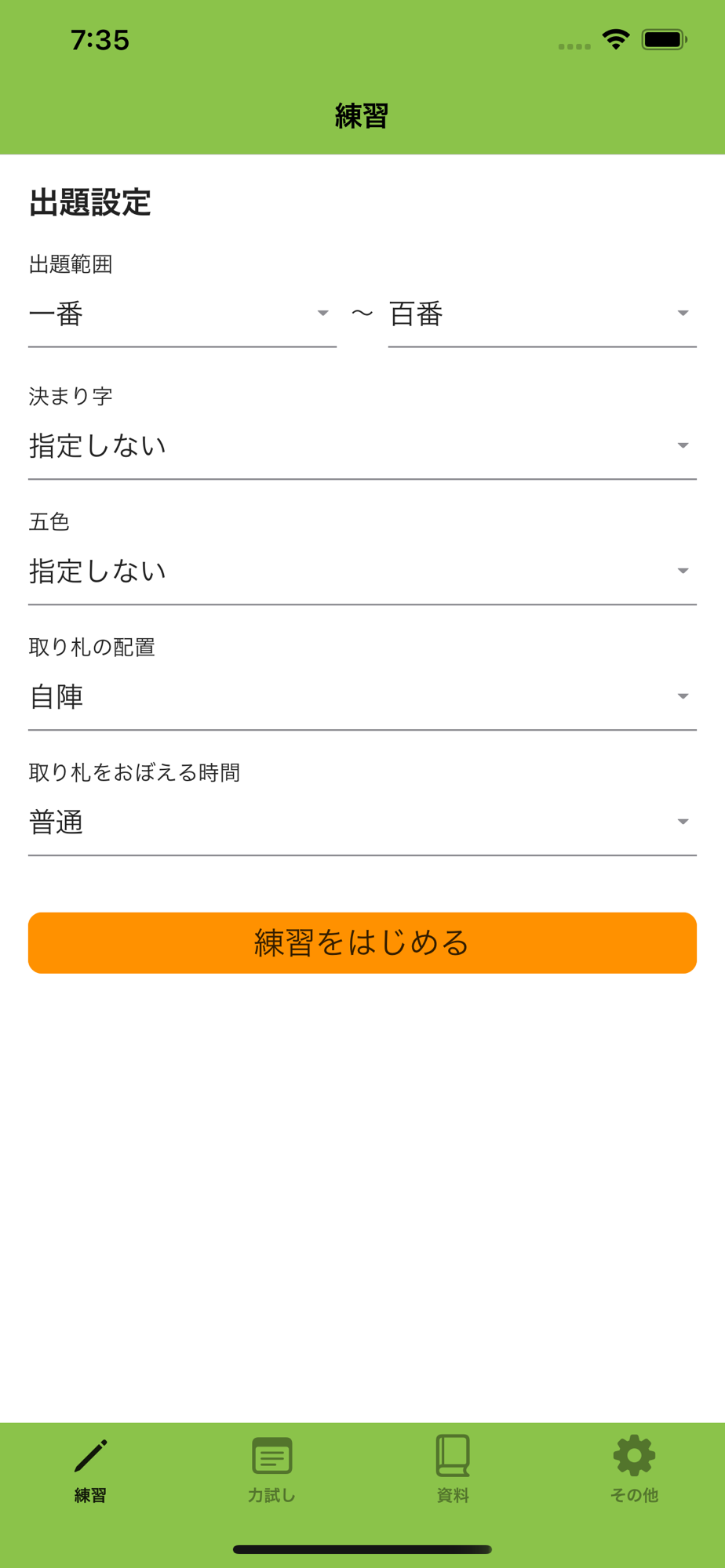 百人一首の総復習として全百首がランダムに出題されます。結果は最大十回まで端末に保存され、過去間違えた問題だけ練習することもできます。取り札の表示の向きはランダムで変わります。