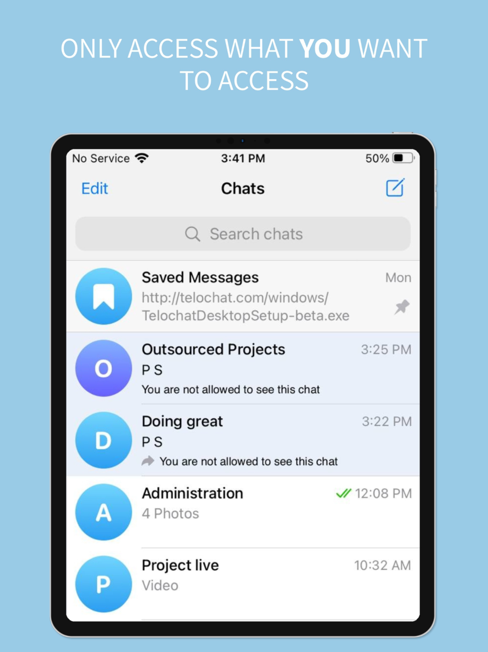* Advanced Filtering: TelOChat for Business ensures a clean, professional environment by blocking public channels and groups. Users can navigate Telegram without encountering distractions or inappropriate material. Which user can request access to manually or via selecting predefined whitelists