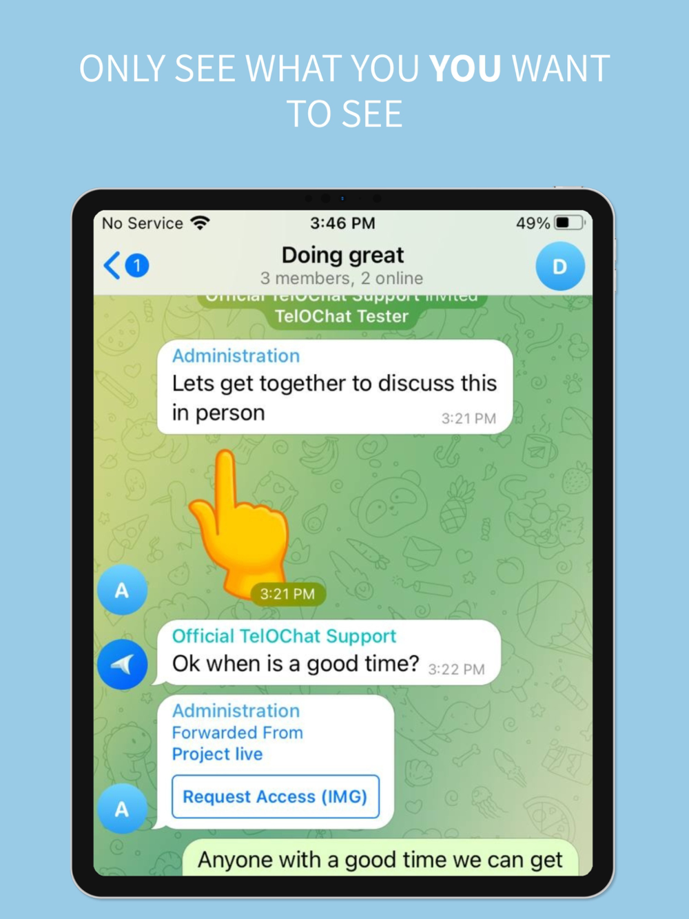 * Customizable Media Control: TelOChat for Business offers unique control over chat content. Users can opt to view only text messages, or selectively allow certain media types like documents or images, catering to diverse user preferences.