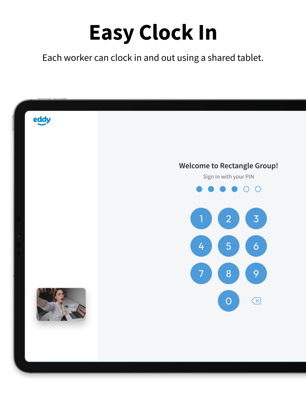 Eddy's Tablet Time Clock app is for companies who have employees to clock in and out using a central time clock. Your workers are each assigned a unique PIN code. The app can even take a photo of each person during clock in to help you prevent time theft. Time blocks automatically sync with your Eddy account. Requires an internet connection.