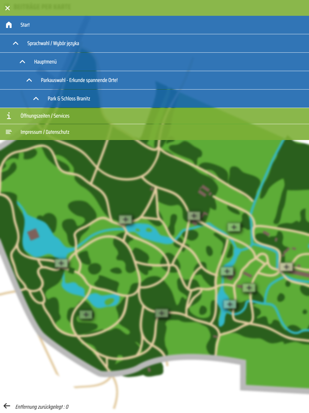 Auf dem Startbildschirm erhältst du einen guten Überblick zu den Parkanlagen und kannst mit einer Zoom-In-Funktion in verschiedenen Teilbereich der Spazierrouten reinschauen bevor du dich für eine Tour entscheidest.