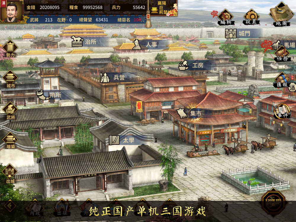 基础的内政安排、人事探索、军事侦察、技术开发都采用放置类管理模式,减少繁琐的重复操作,让玩家能聚焦其他事件。君主扮演模式,玩家只需要关注首都以及国家的管理。其他城市交给太守进行管理。使用方针给分城下达不同的军政指令。