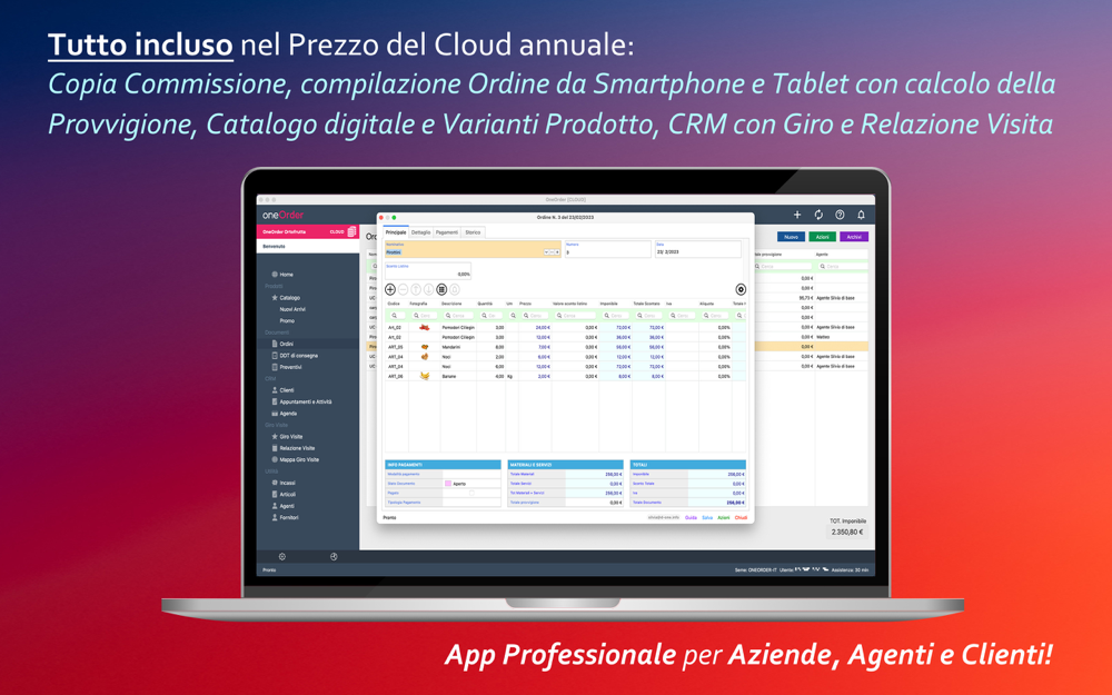 Oneorder è l'App completa di programma per la Raccolta Ordini, gestione delle vendite, Catalogo Prodotti Digitale, dedicata agli Agenti di commercio, alla Rete vendita e al Cliente finali.