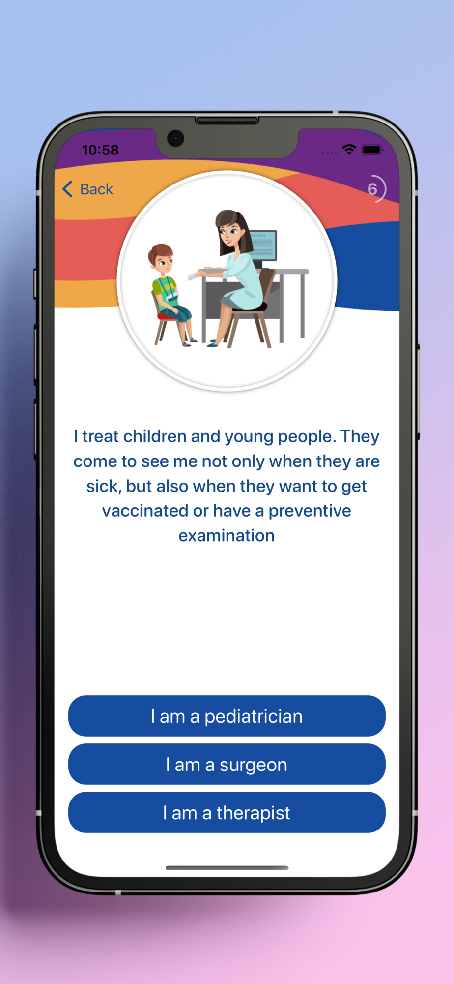 Guess the Profession is a classic children's quiz that consists of choosing the correct answer from a brief description of the profession. The quiz consists of 15 topics. For the passage of the topic, an assessment is made. The best results are stored in the high score table.