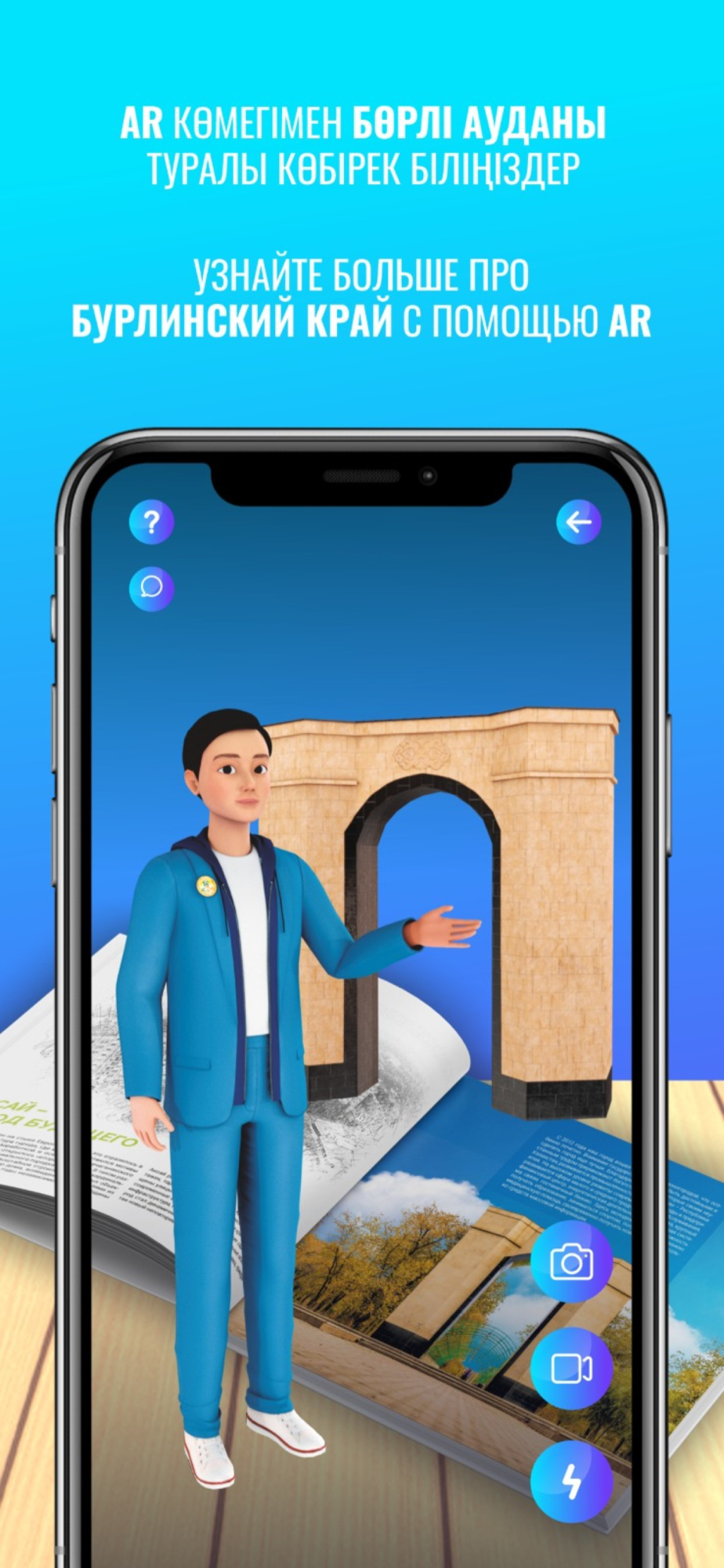 Скачайте бесплатное мобильное приложение AR Aksay и наведите камеру телефона или планшета на 3D-значок на страницах книги «Бөрлі. Қазыналы мекен», чтобы совершить познавательную экскурсию.