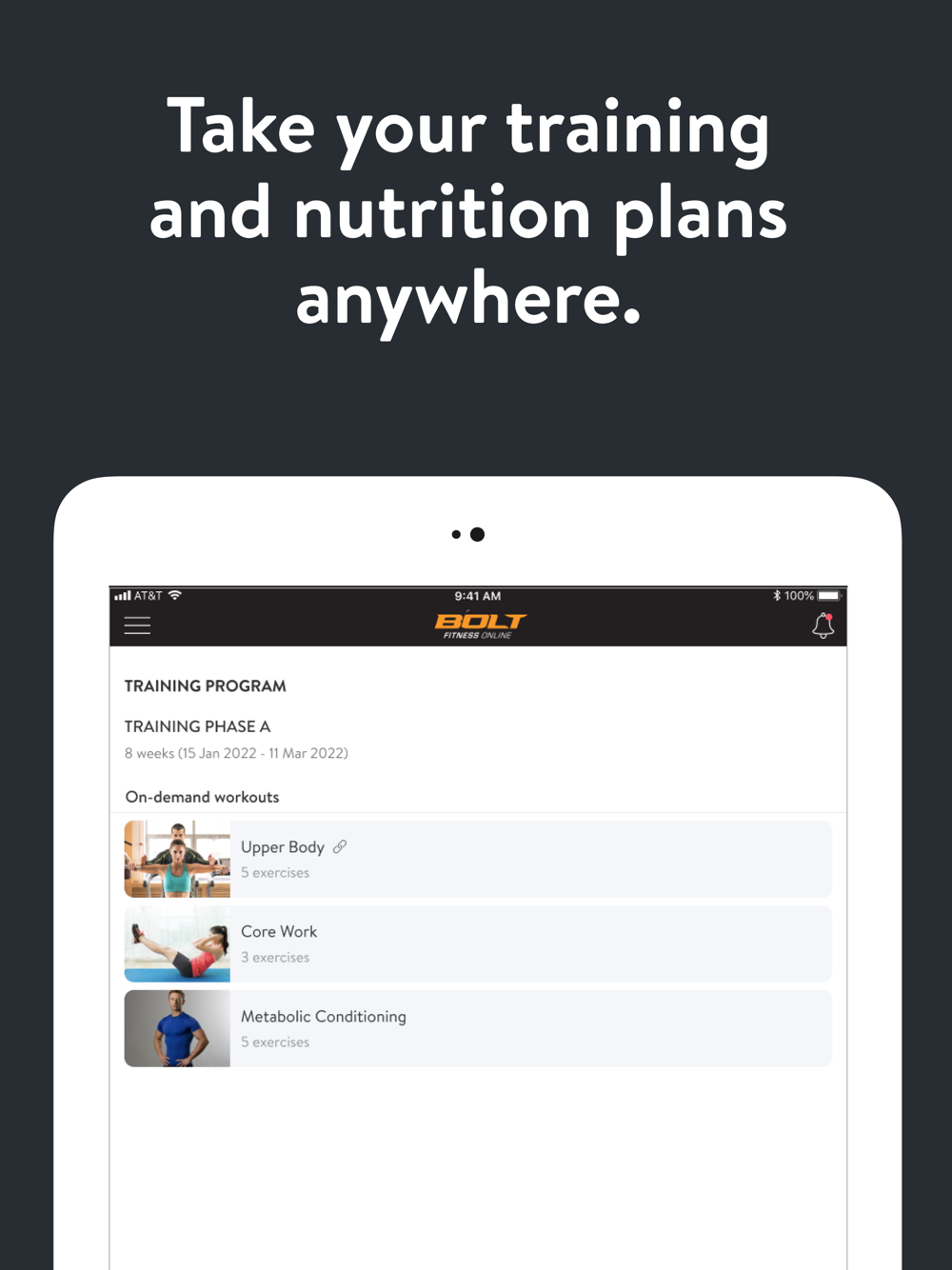 With the BOLT FIT ONLINE App, you will have access to workout programs designed specifically to help you reach your fitness and health goals! You can follow & track your workouts, your nutrition, your lifestyle habits, measurements and results–all with the help of your own coach.