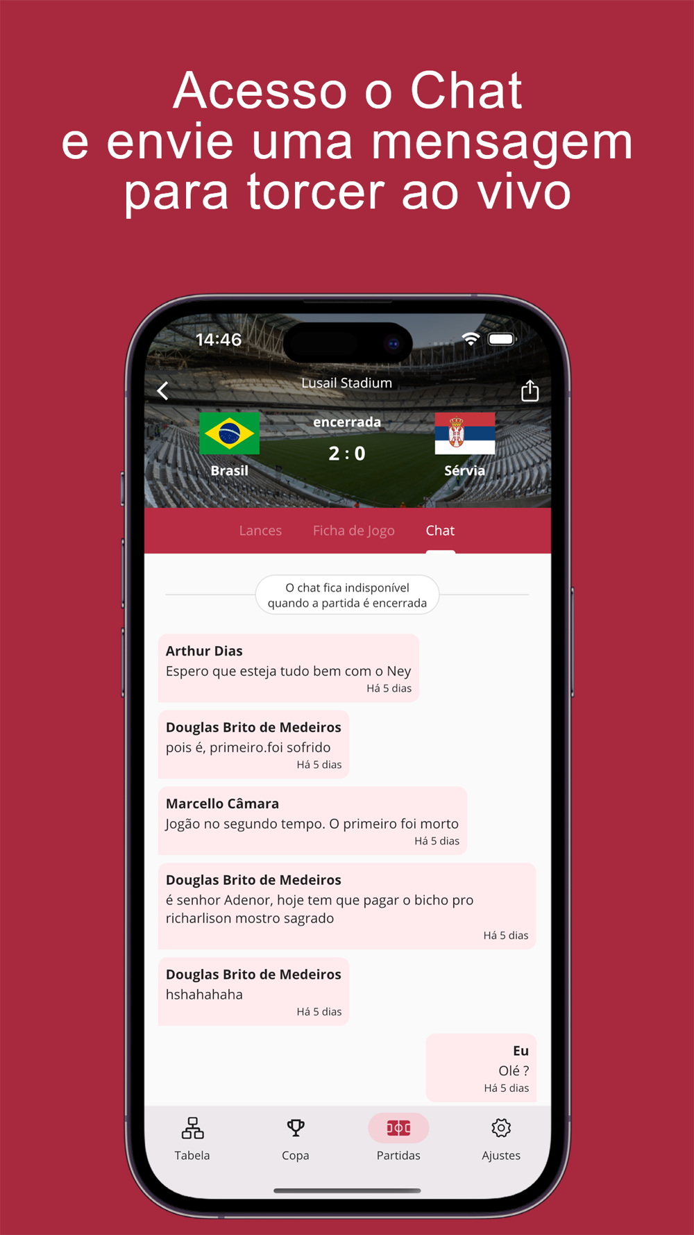 Acesse o chat e envie uma mensagem para torcer para o Brasil ganhar o hexa! O chat fica disponível durante as partidas ao vivo.