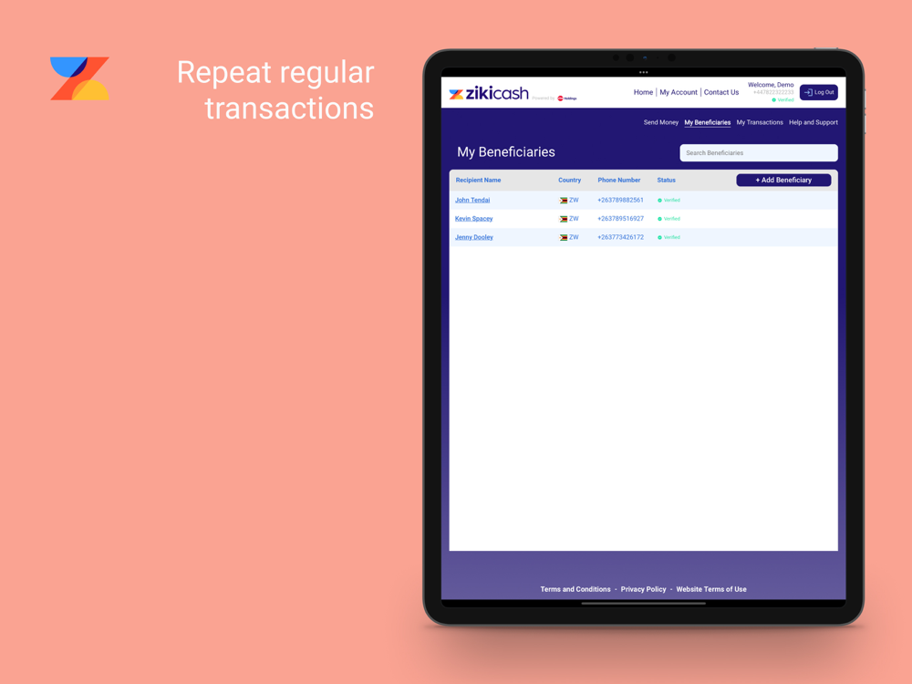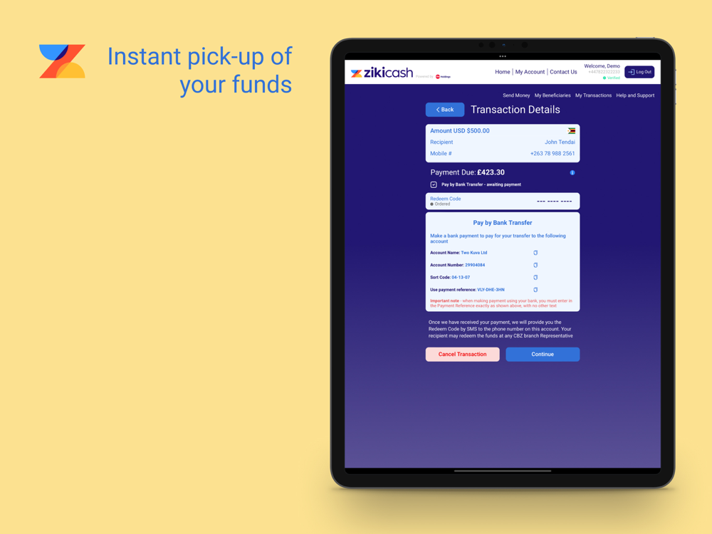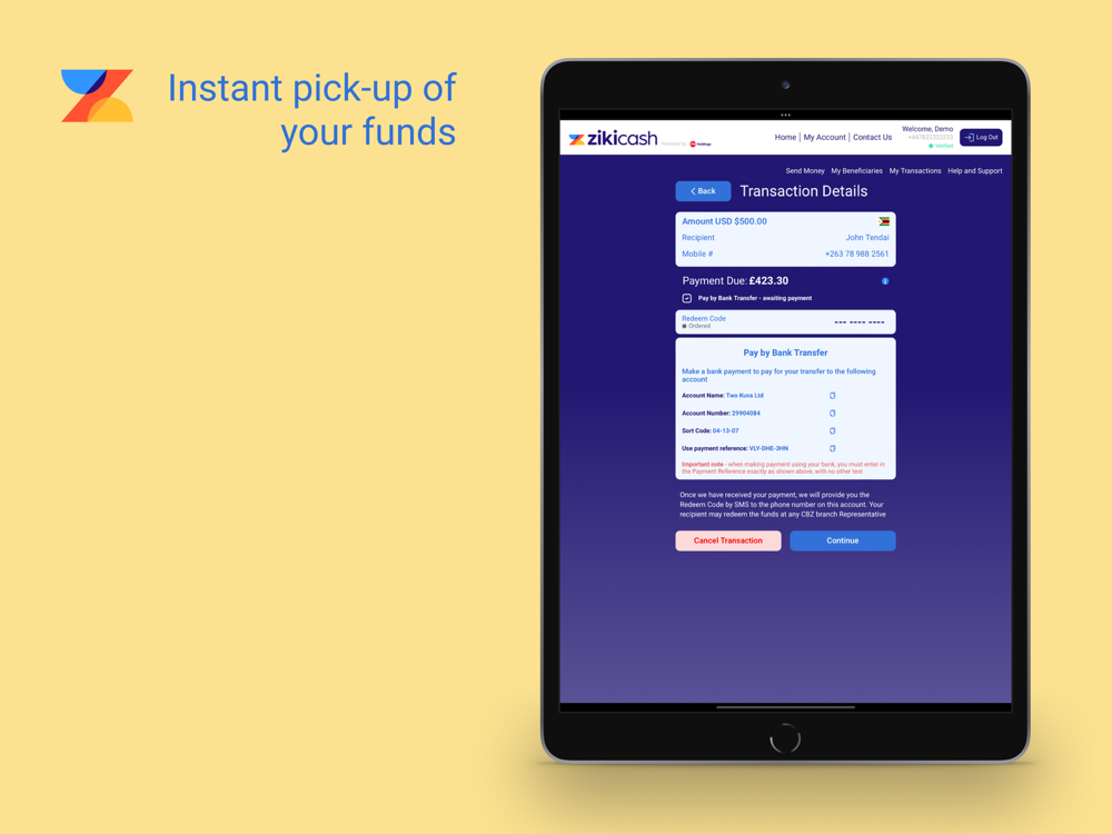 The Zikicash is an online money transfer service allowing a sender to initiate a money transfer conveniently via our app.