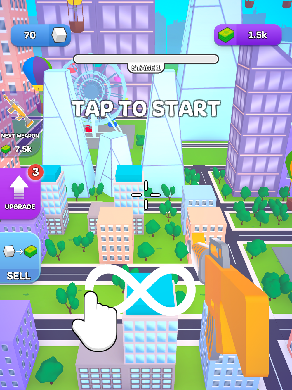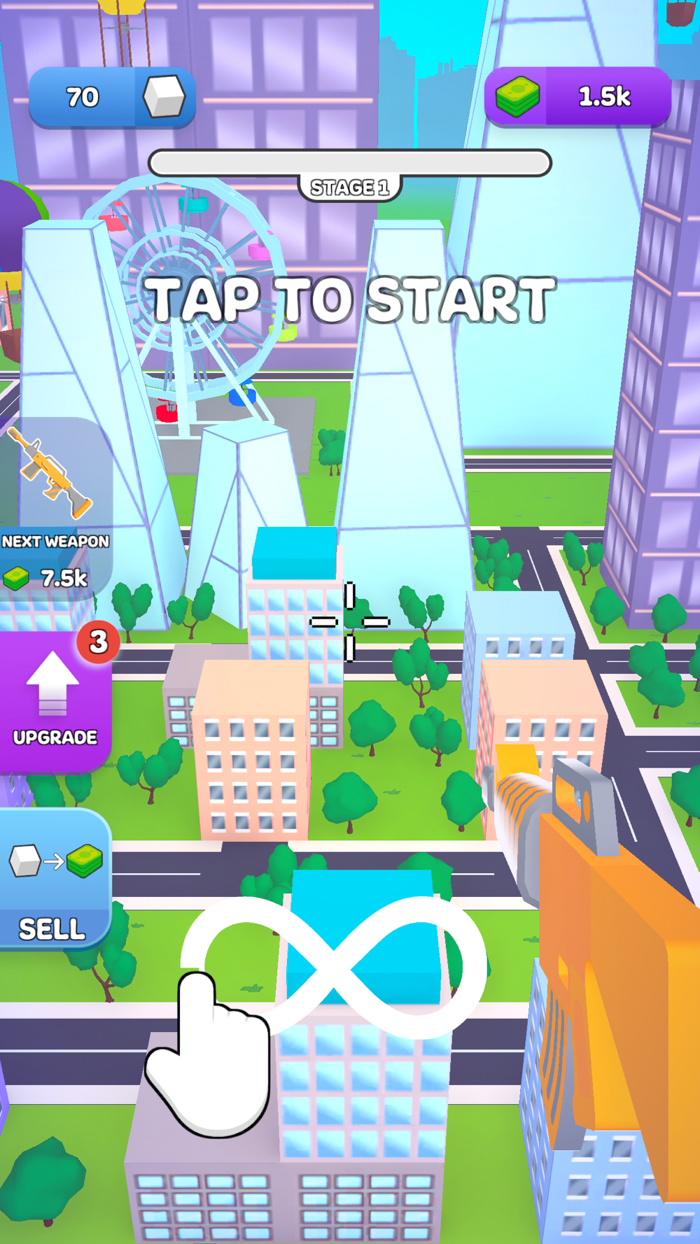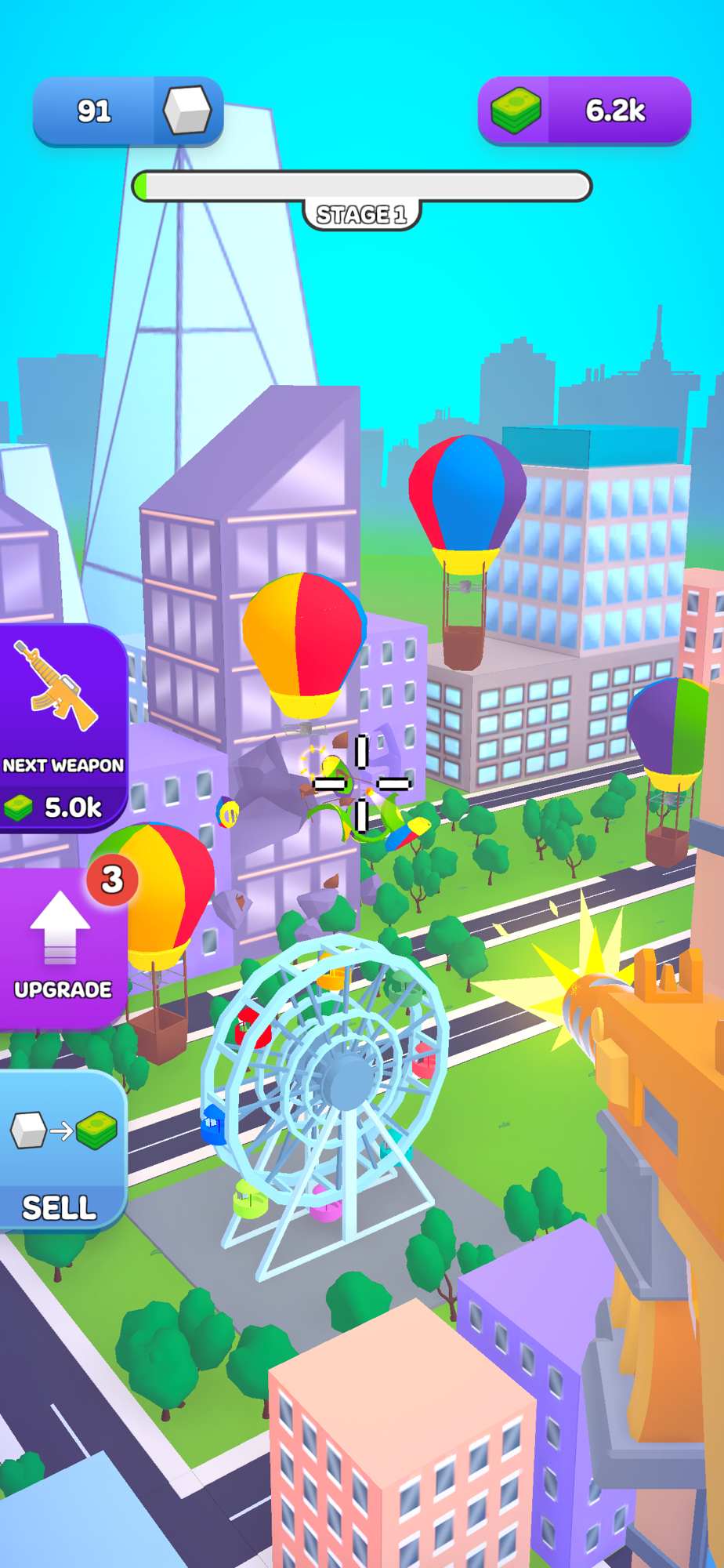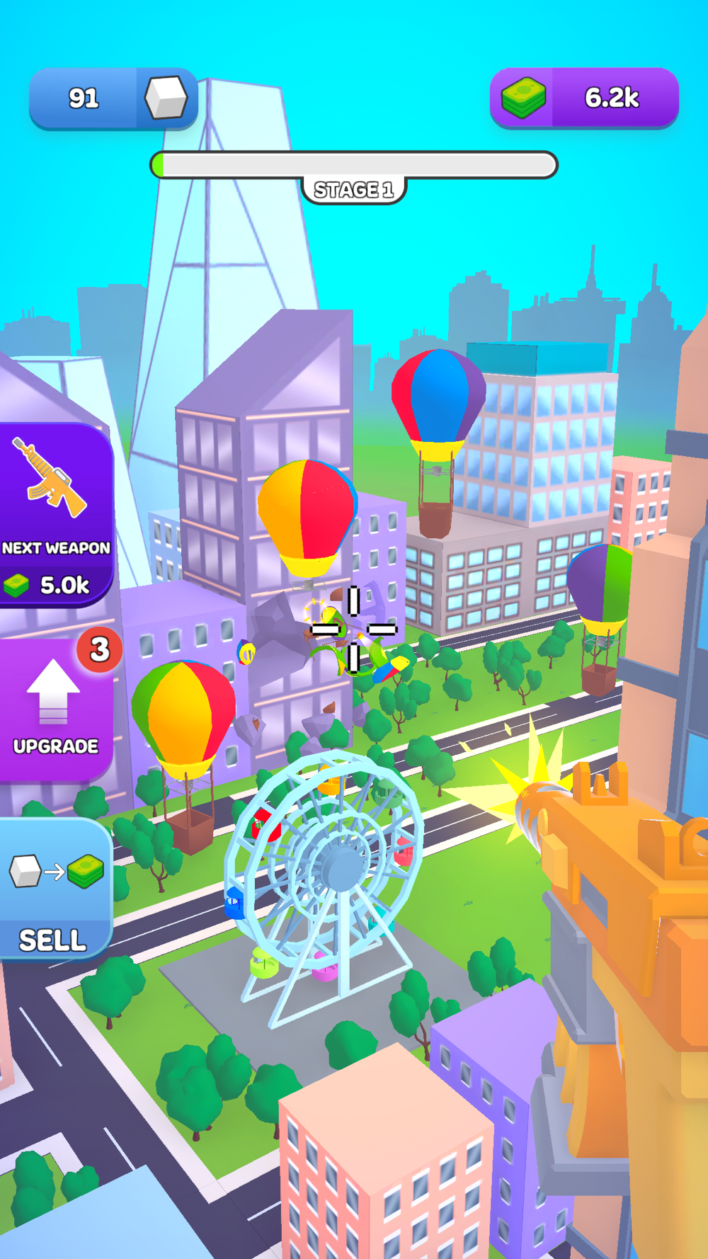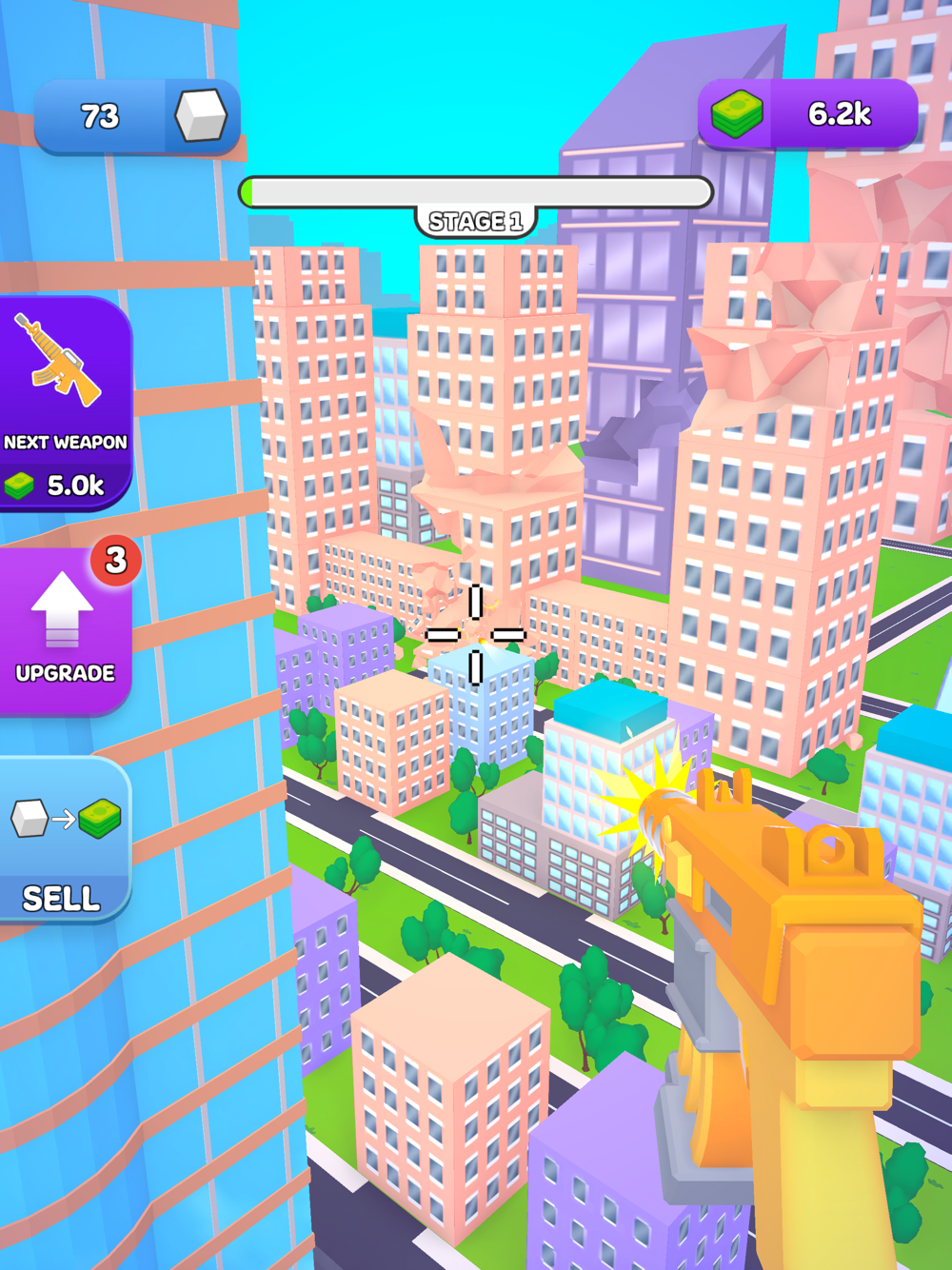 Shoot around and try to destroy the city. You can destroy parks, sky-high buildings, and much more stuff. Unlock and collect all the weapons and boost your power by buying upgrades. Show your might to the world by destroying everything!!