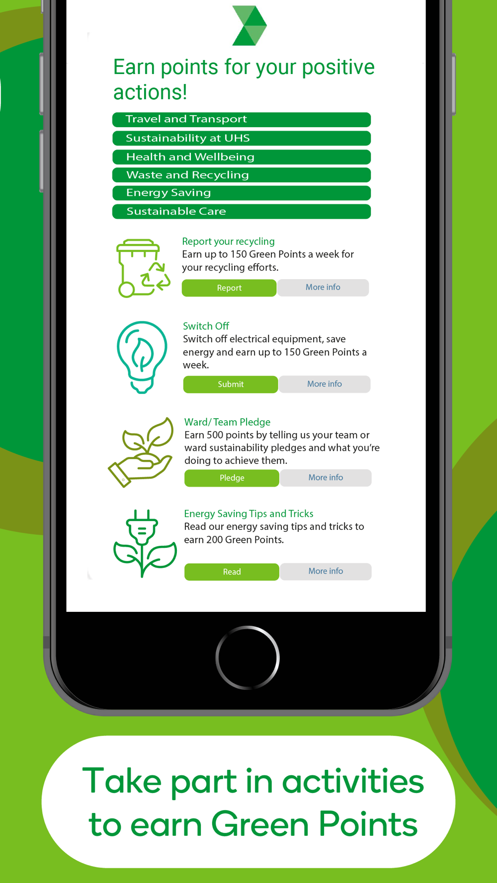 With this app you will be able to earn Green Points for your actions in themes including waste and recycling, energy saving, sustainable care, travel, and wellbeing.