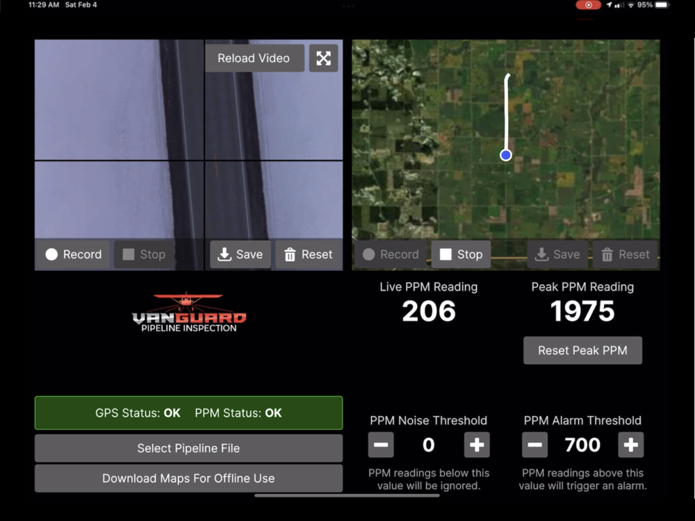 The VanGuard app connects with the Falcon-XL aerial methane detection system. This system attaches to manned aerial for pipeline patrol leak detection missions. Using this app, users can monitor the methane concentration in the air, be alerted of any gas leaks, while monitoring the downward facing camera over the pipeline right of way.