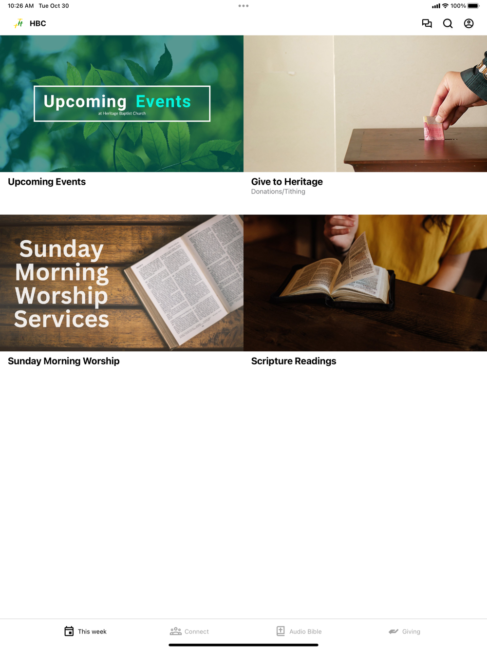 This app will help you stay connected with the day-to-day life of Heritage Baptist church. With this app you can: watch or listen to past messages; stay up to date with push notifications; share your favorite messages via Twitter, Facebook, or email; and download messages for offline listening.