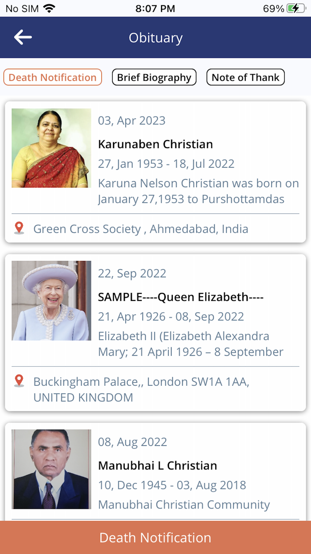 5. OBITUARY offers quick Death notification, Brief biography and Notes of Thanks
